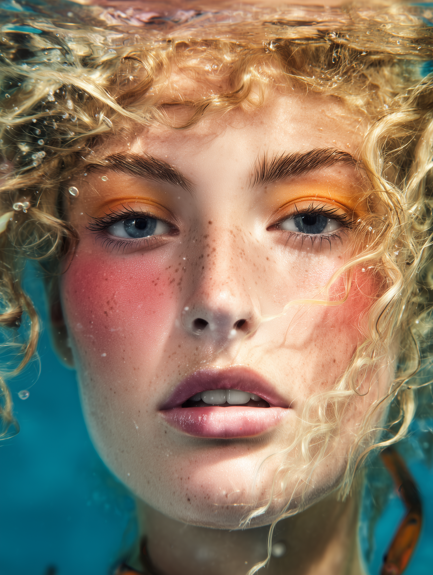 Close-up of a person with curly blonde hair and vibrant makeup, partially submerged in water with a clear blue background.