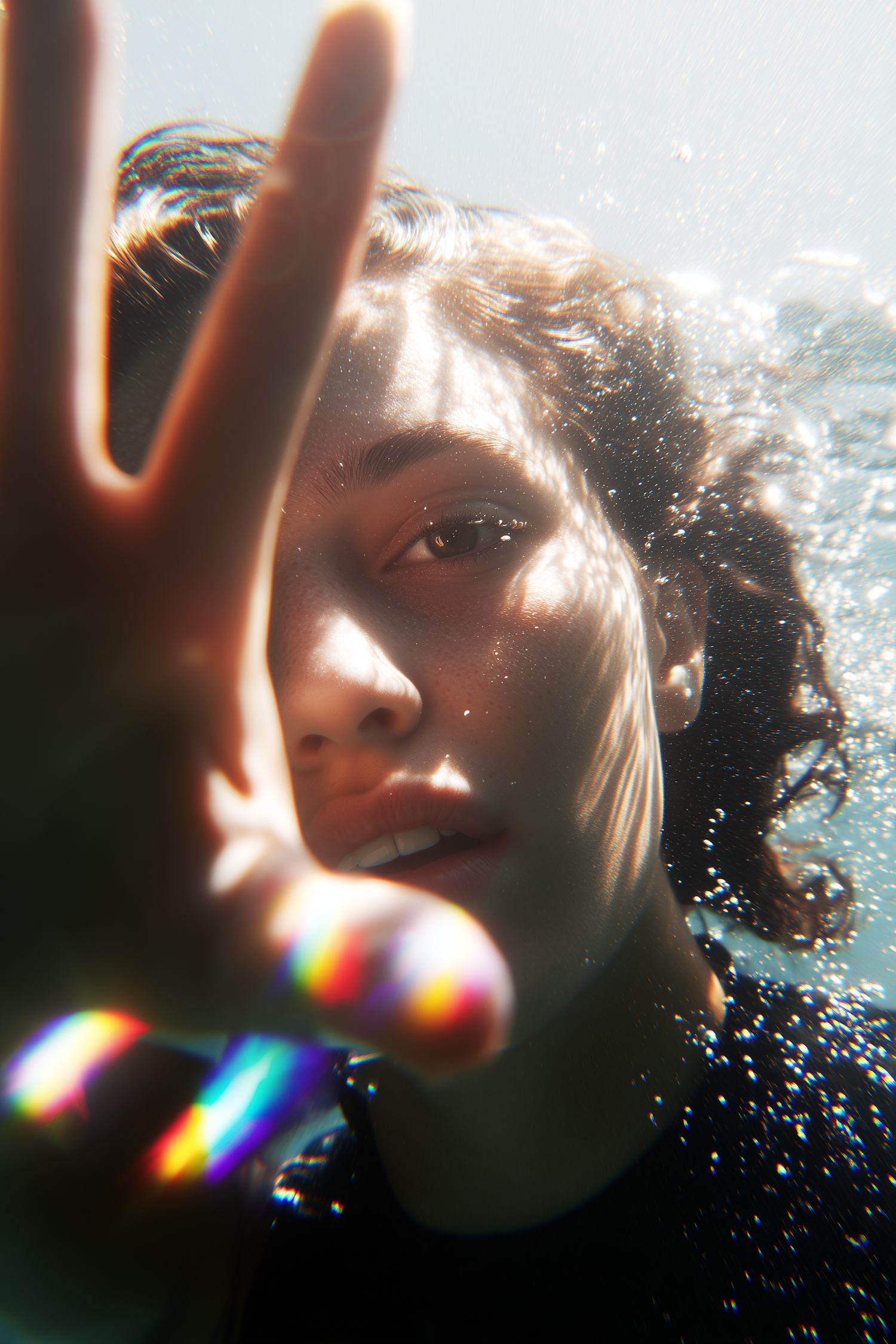 Close-up underwater portrait with sunlight casting rainbow patterns on a hand, creating a dreamy and introspective vibe.