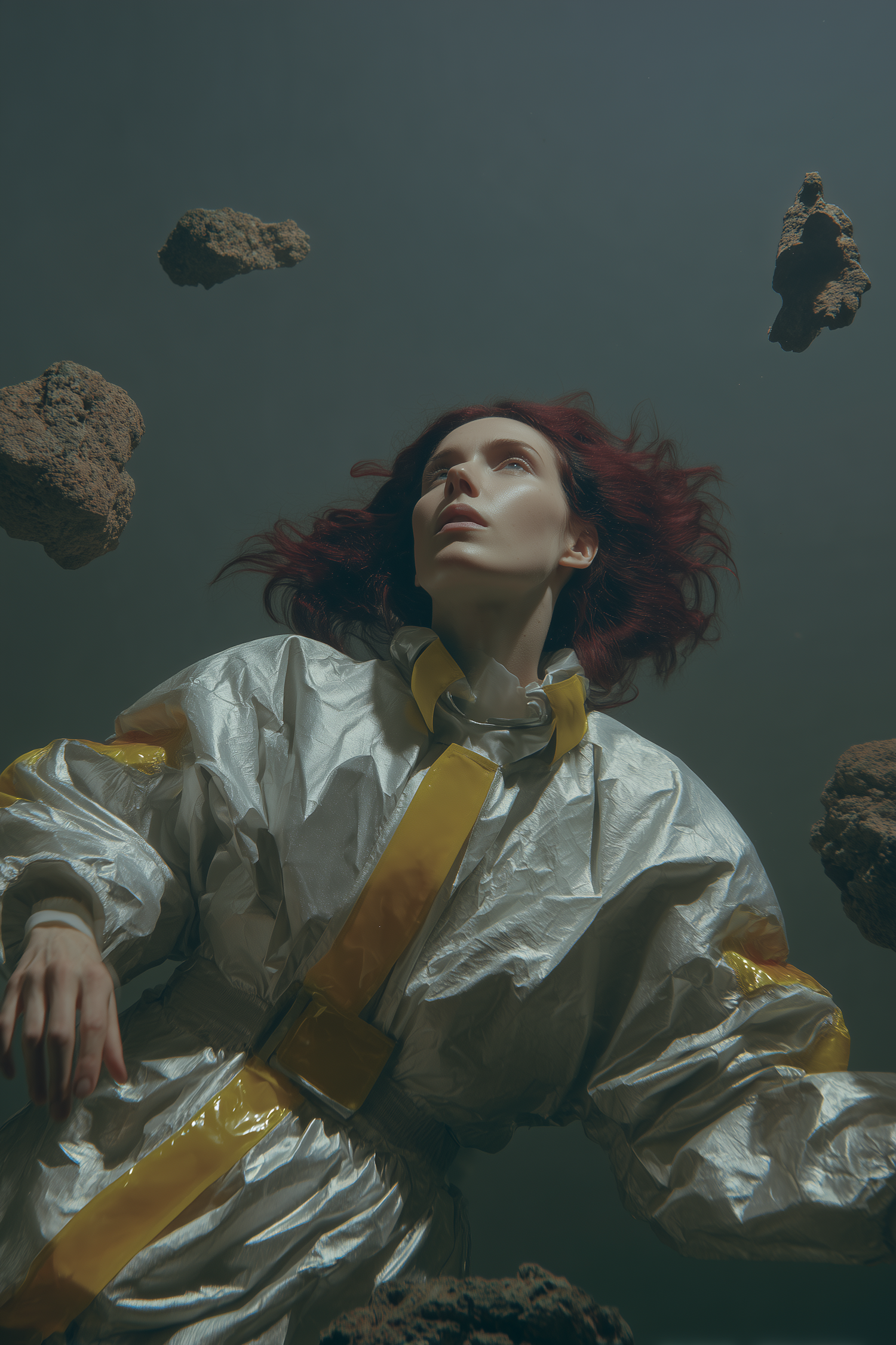 A surreal underwater scene with a figure in a reflective silver suit surrounded by floating rocks, exuding a dreamlike and otherworldly ambiance.