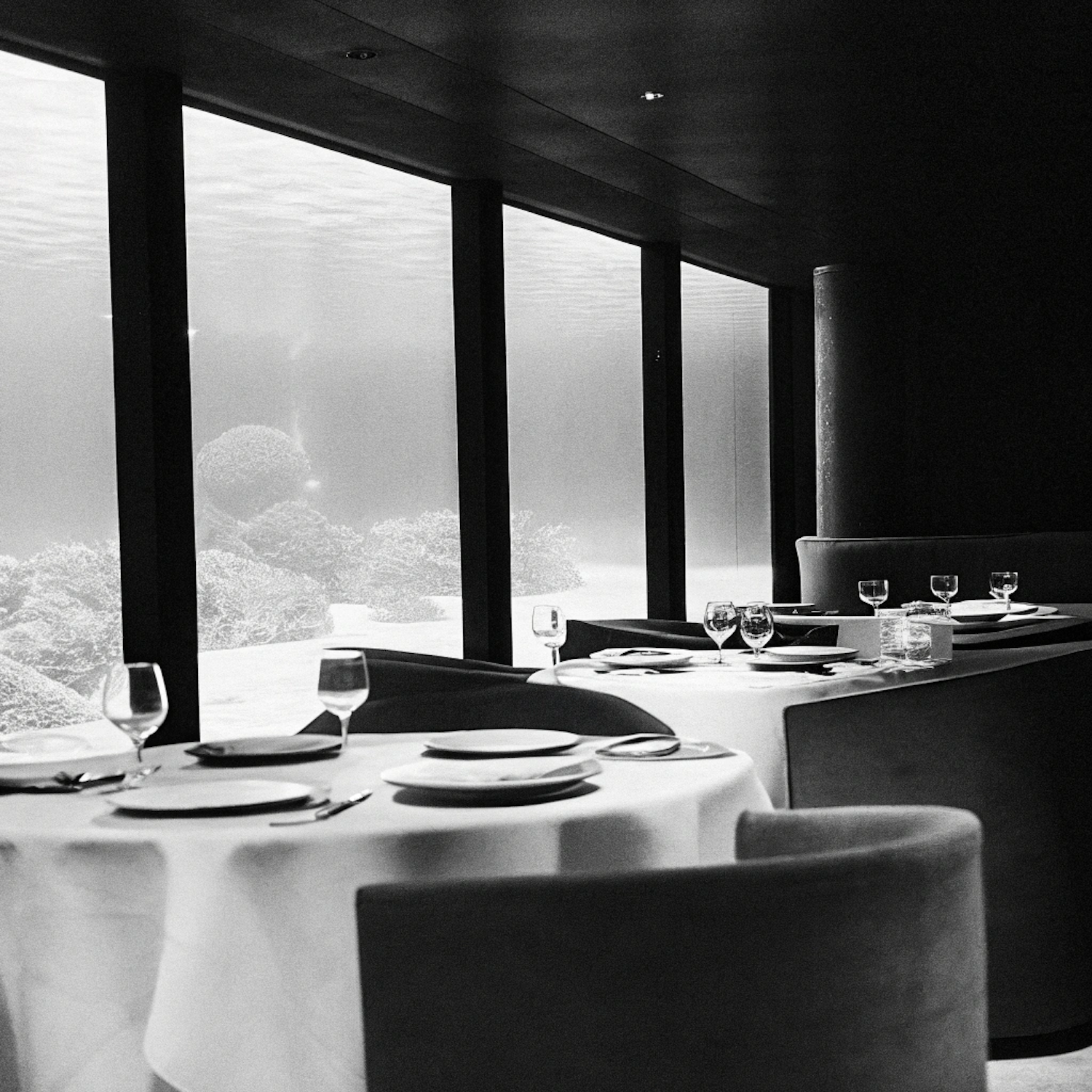 Elegant underwater restaurant with white tablecloths, modern seating, and large windows showcasing serene aquatic views.