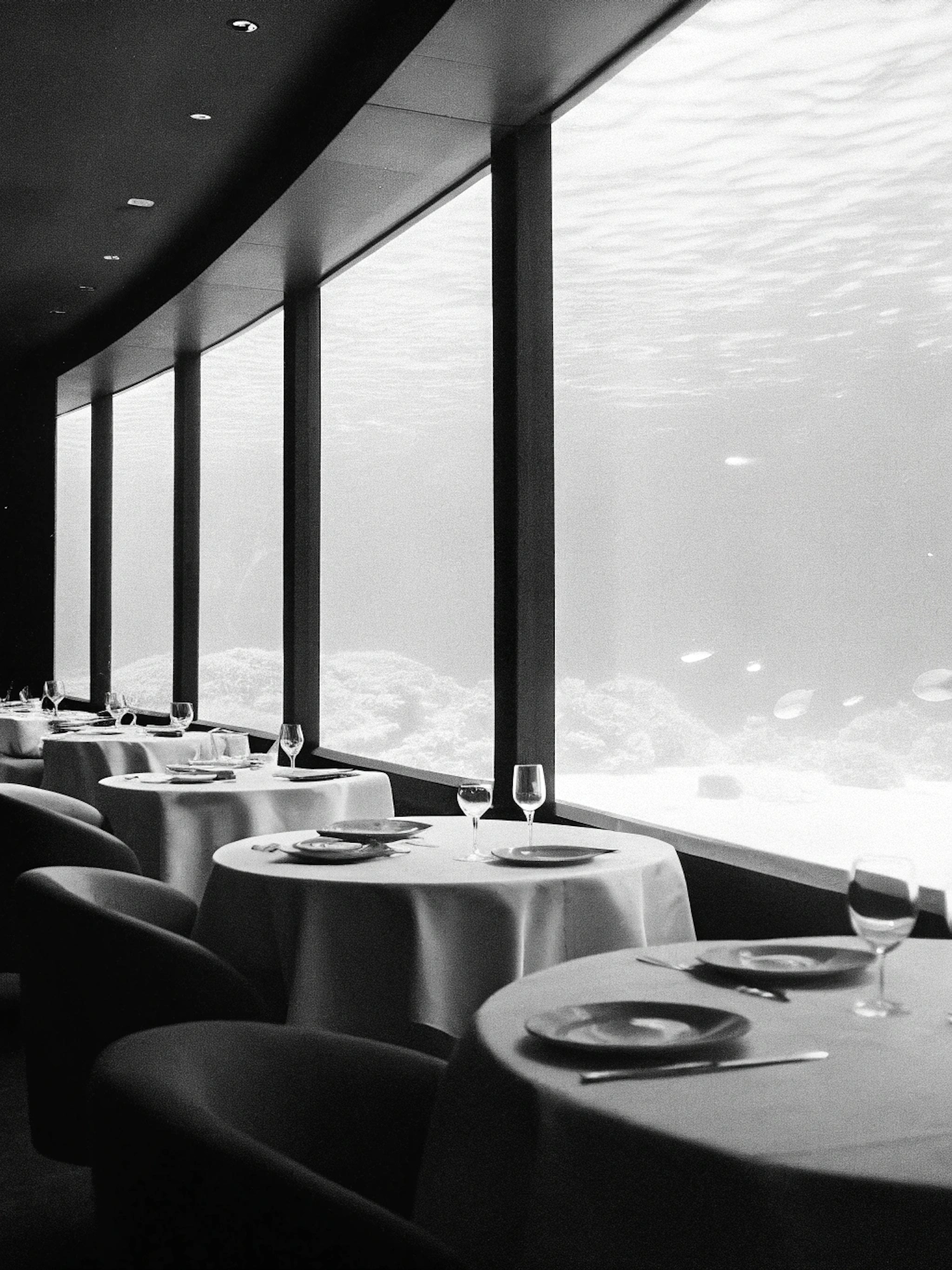 Elegant underwater restaurant with white tablecloths, wine glasses, and a serene view of coral and fish through large windows.