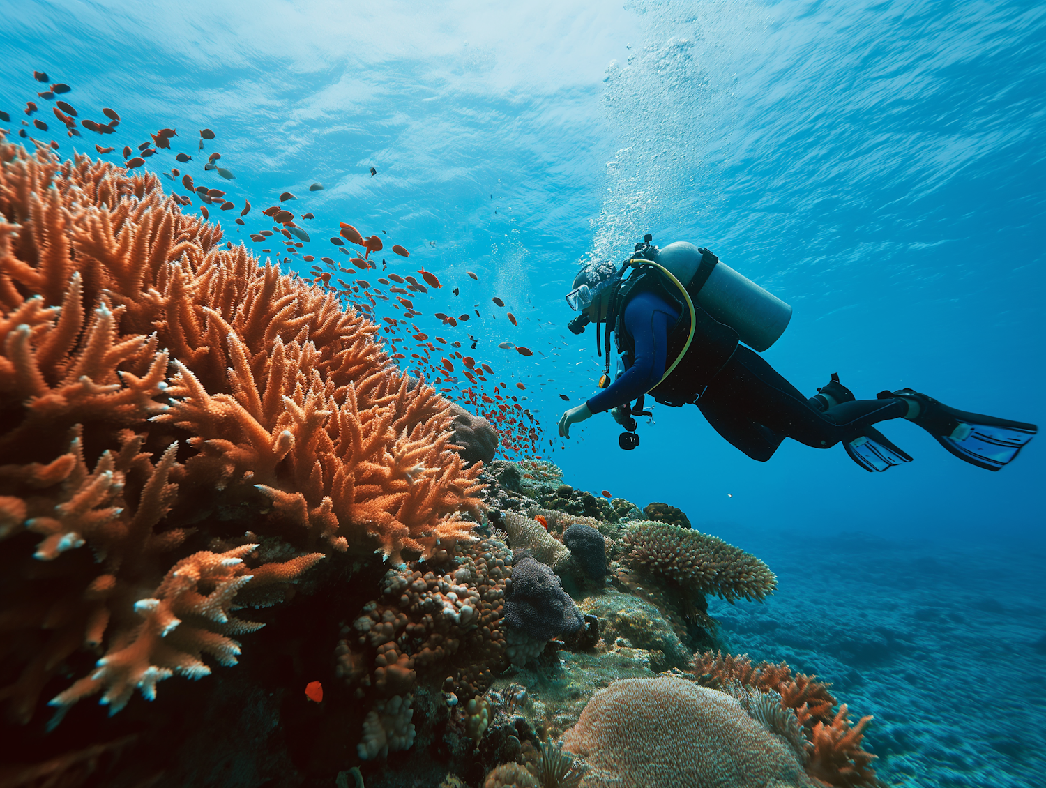 Scuba diver explores vibrant coral reef with orange fish in clear blue water, showcasing underwater beauty and marine life diversity.