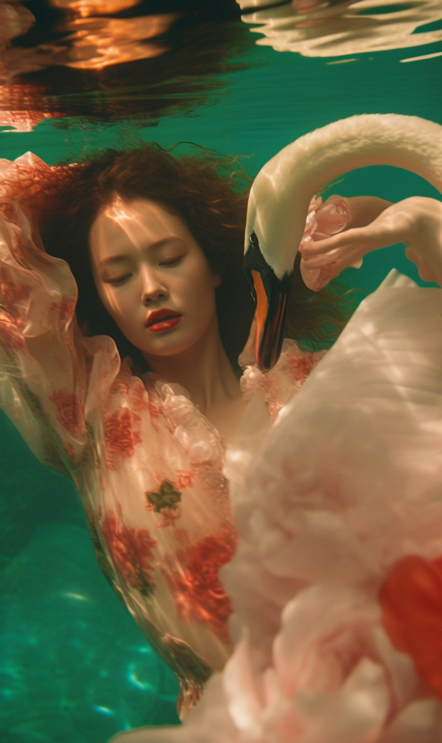 Ethereal underwater scene with a serene woman and a graceful swan, surrounded by flowing fabric and soft light reflections.