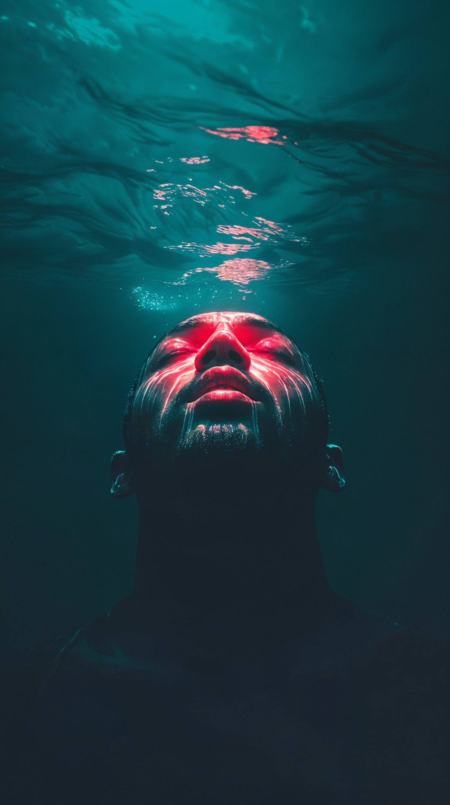 A man underwater with red light illuminating his face, creating a dramatic contrast against the dark teal water.