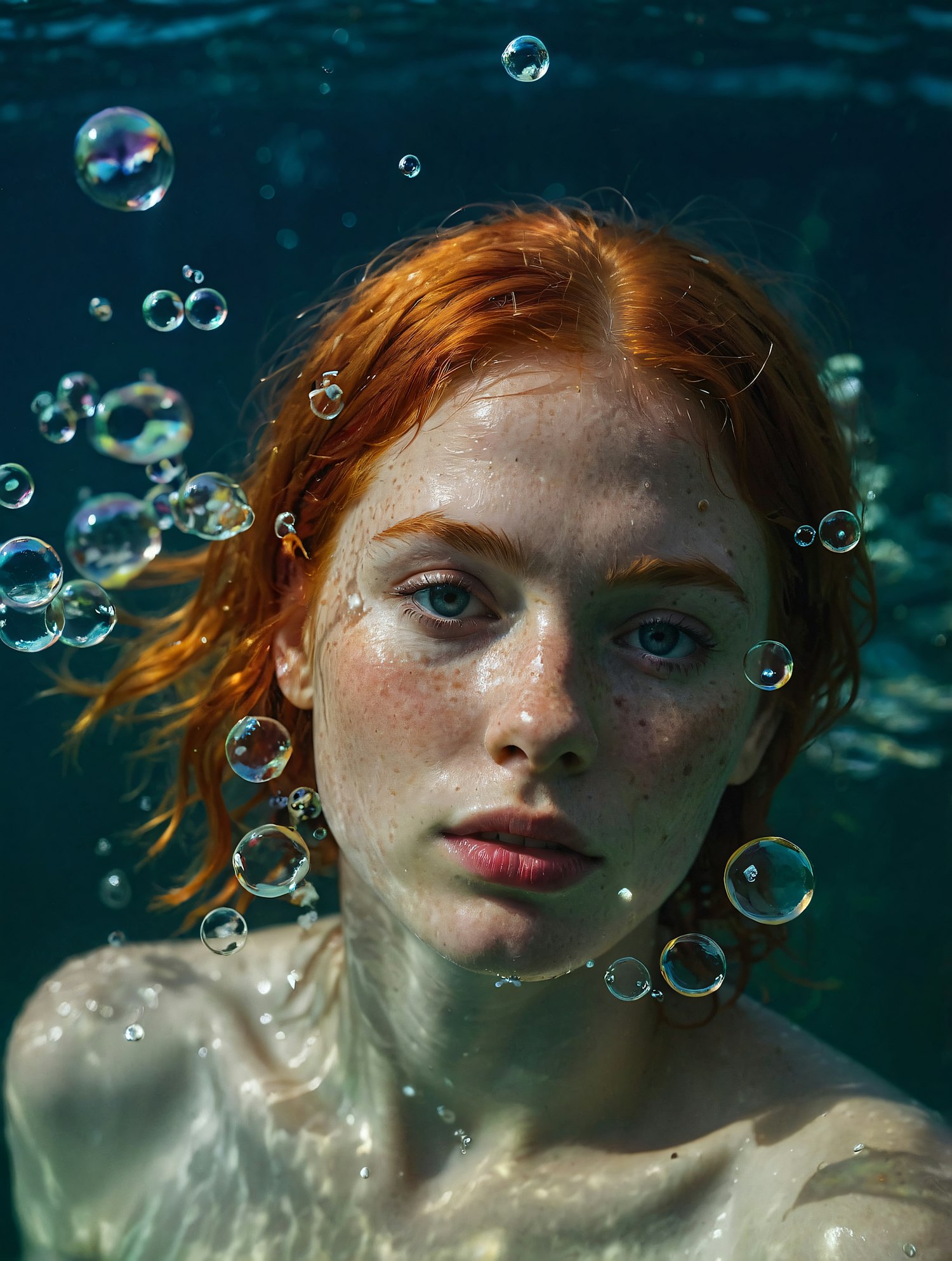 Ethereal underwater portrait of a red-haired woman surrounded by bubbles, creating a magical and serene atmosphere.