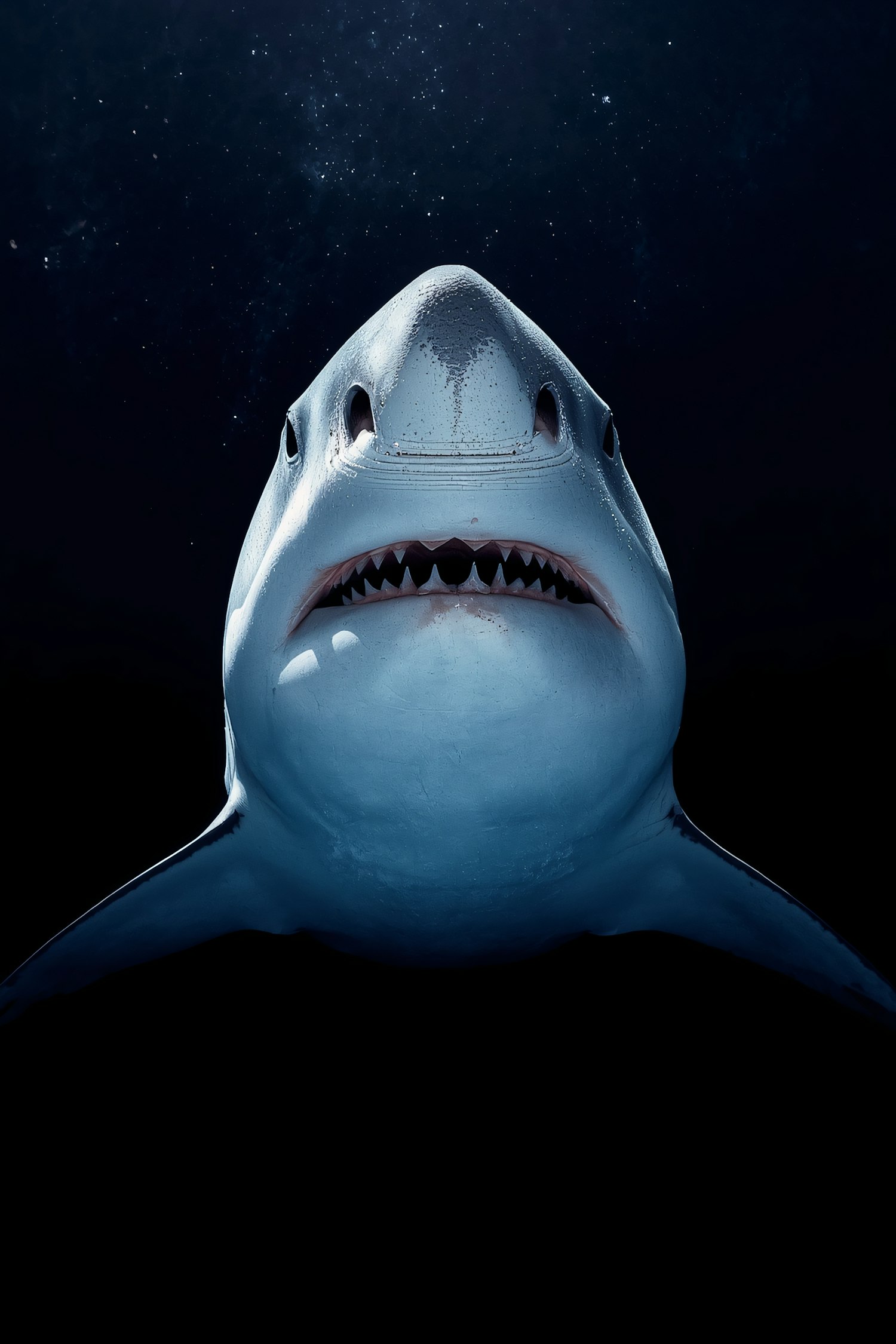 A dramatic underwater view of a shark with its mouth slightly open, showcasing its sharp teeth against a dark ocean background.
