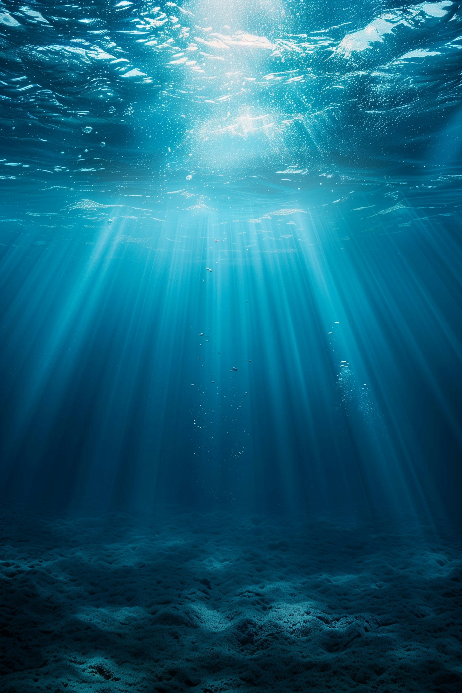Sunlight streams through clear blue water, illuminating a rippled sandy seabed with ethereal light beams and rising bubbles.