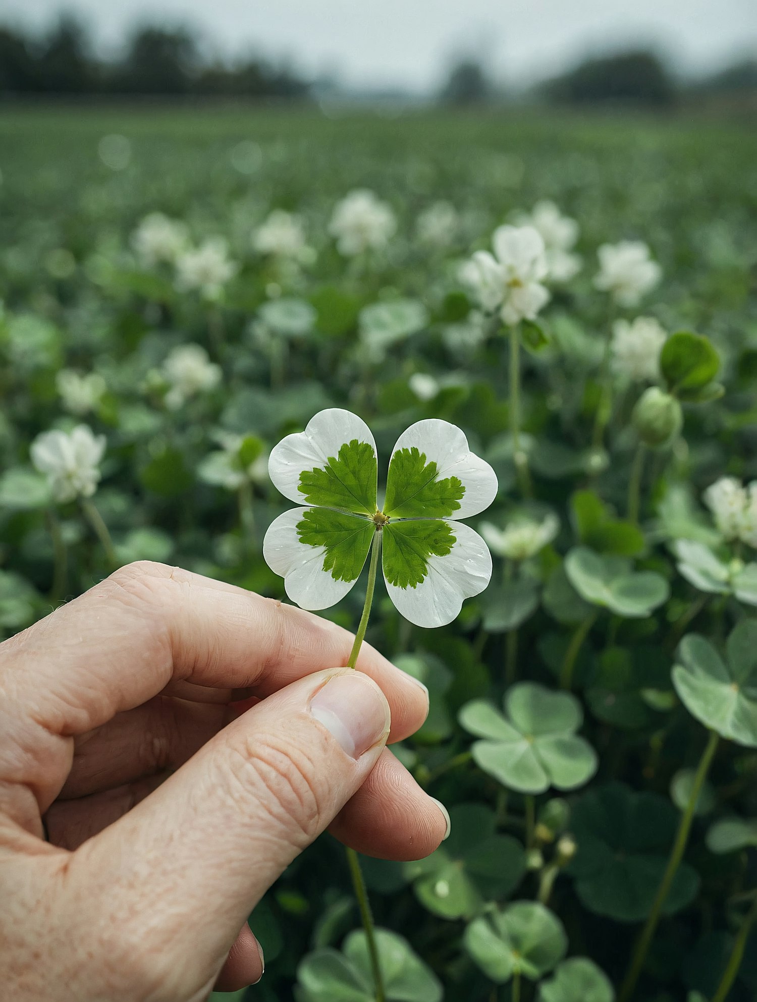 A hand holds a unique four-leaf clover with white edges in a lush green field, creating a serene and natural scene.