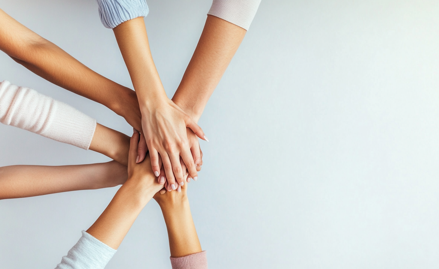 Five diverse hands stacked together, symbolizing unity and teamwork against a plain background.