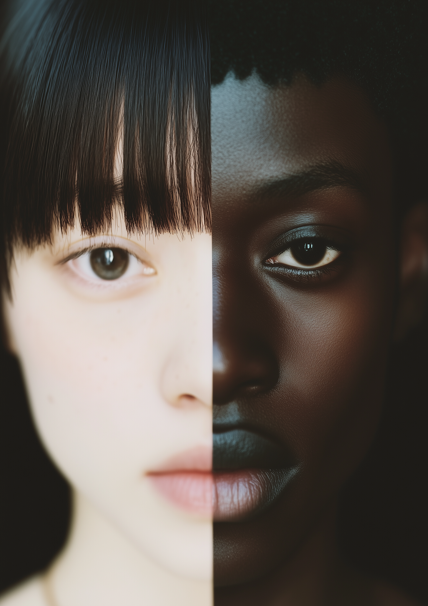 A powerful visual of two faces merged, showcasing diversity with contrasting skin tones, hair textures, and facial features.