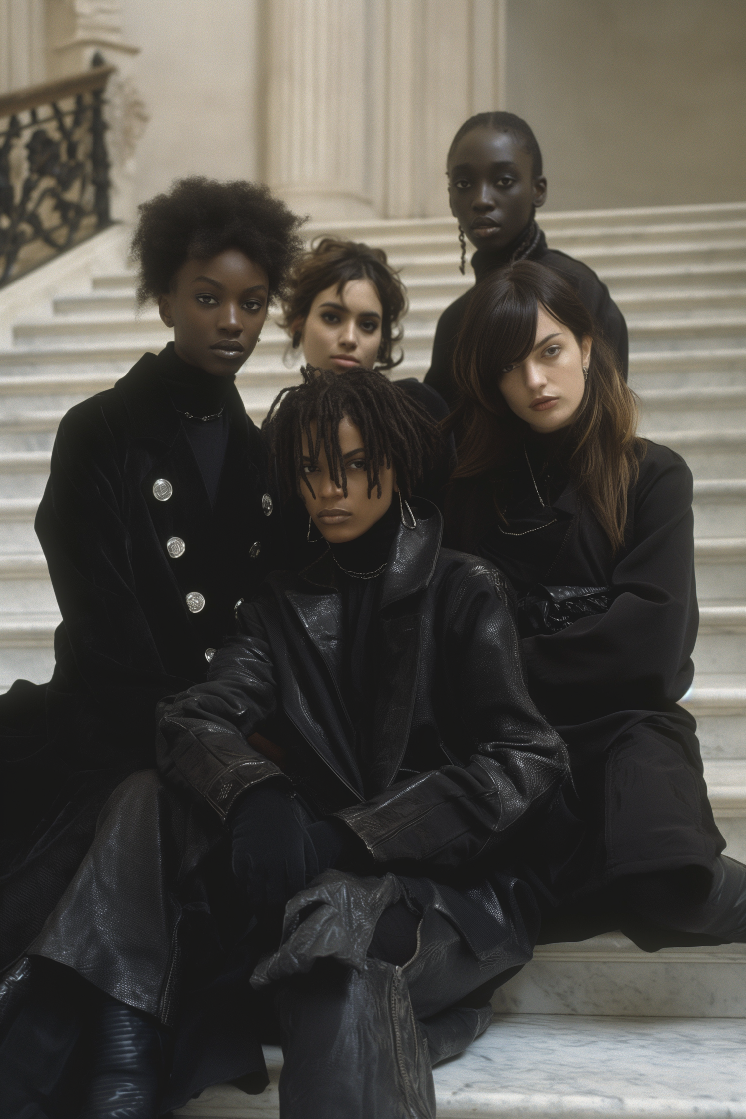 Five stylish individuals pose on a marble staircase, dressed in elegant black attire, exuding confidence and sophistication.