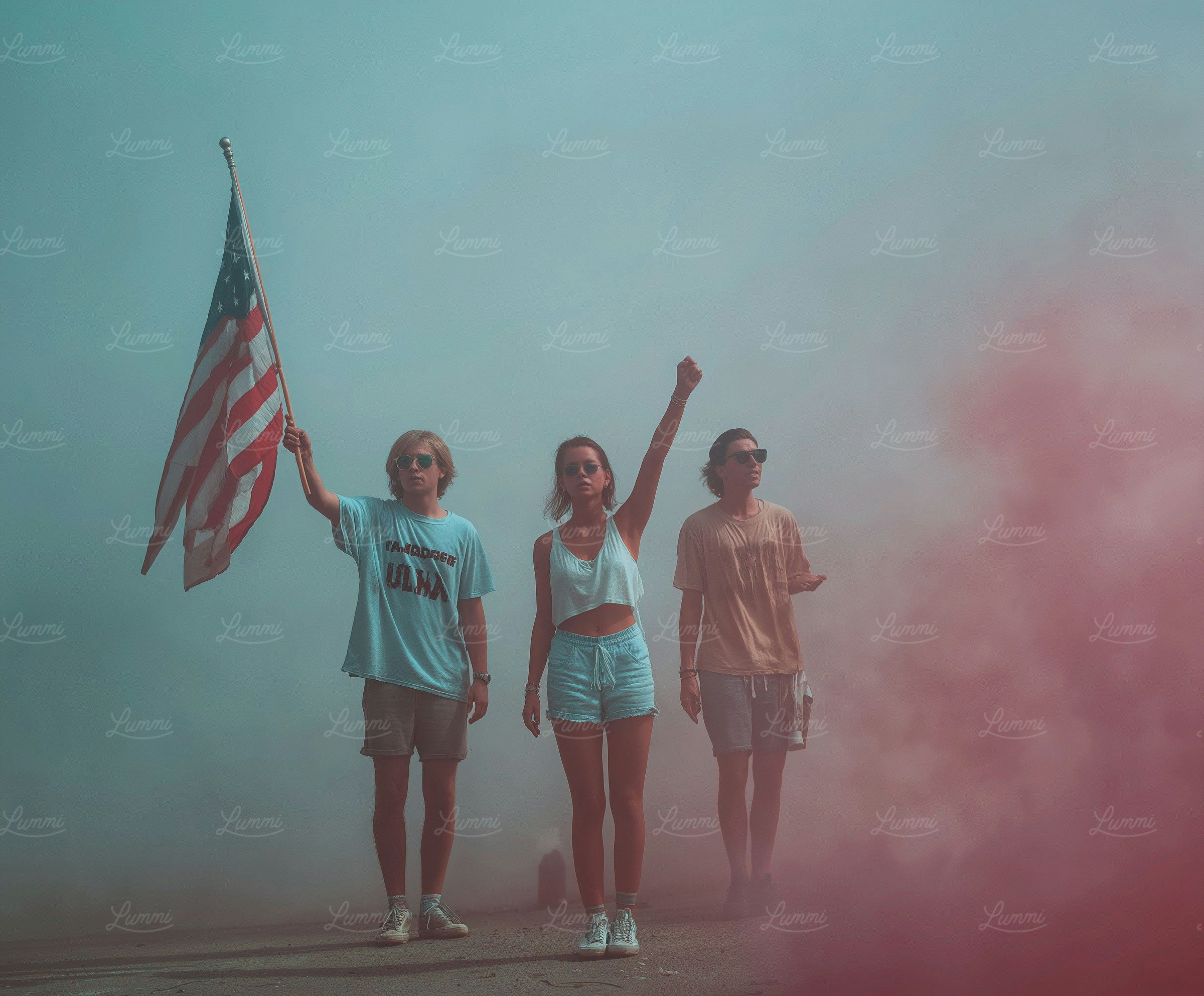 Three young people stand in a smoky outdoor scene, one holding an American flag, another raising a fist, evoking themes of unity and expression.
