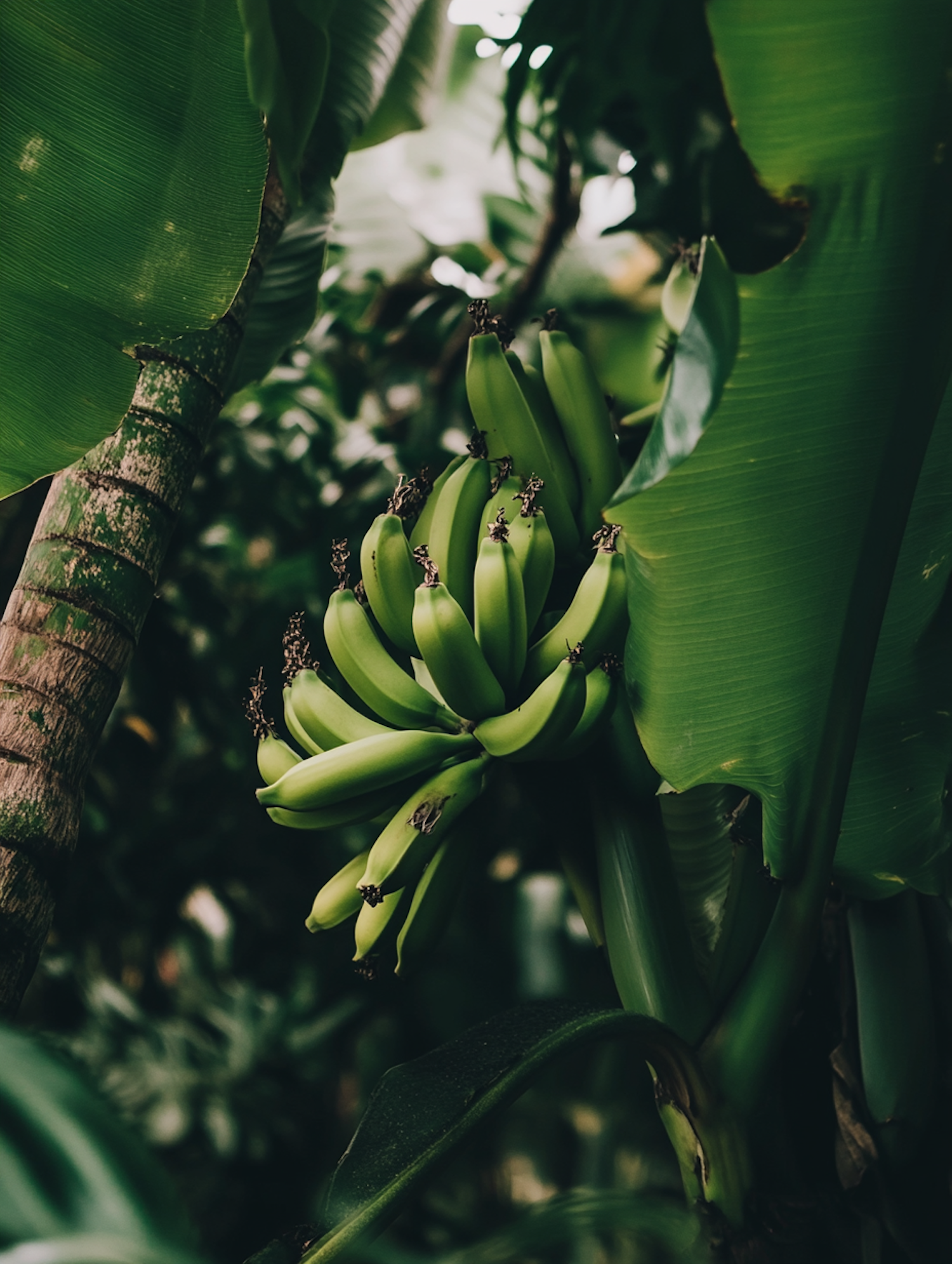 Cluster of unripe green bananas on a tree surrounded by lush green leaves in a tropical setting.