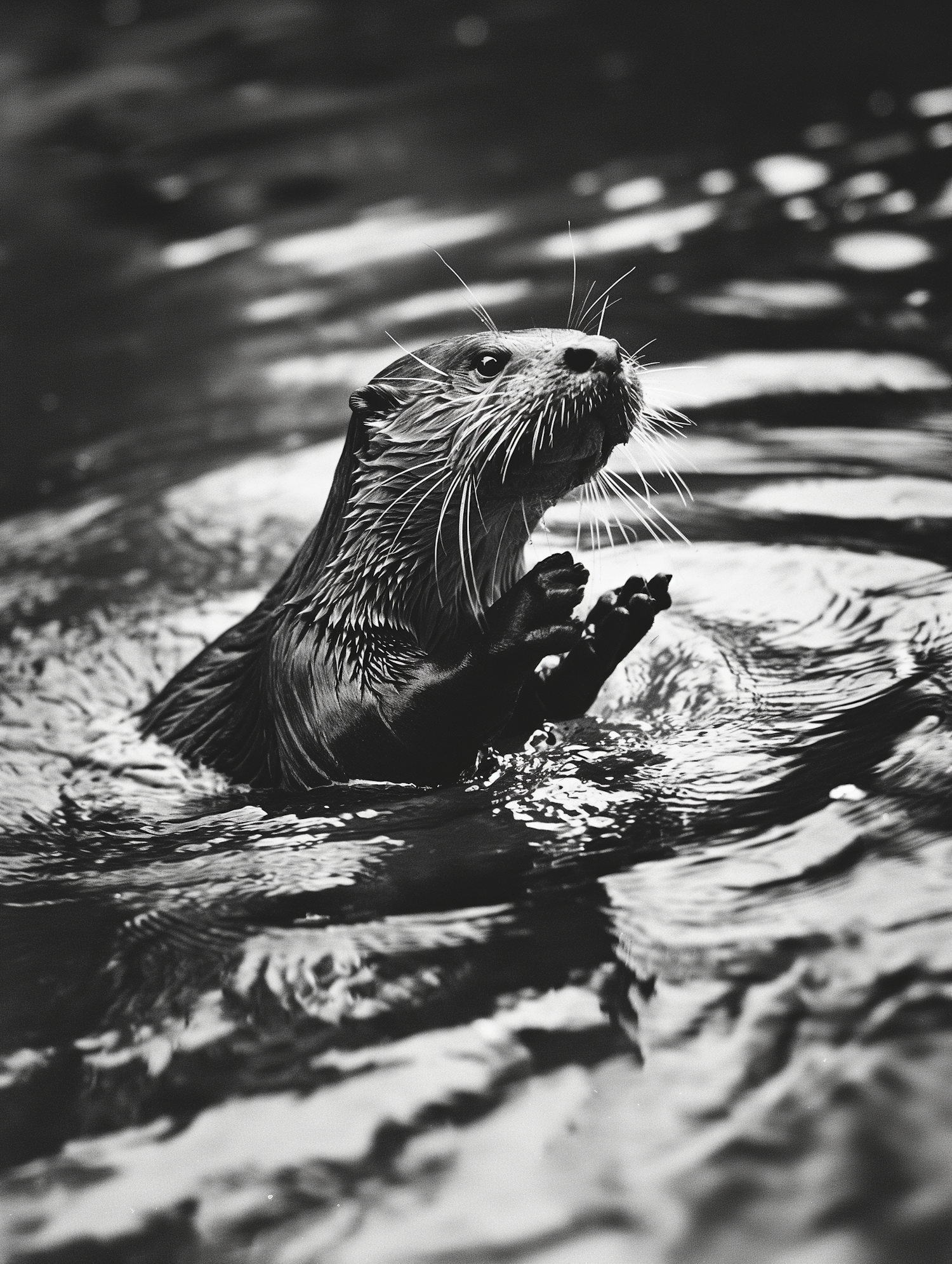 Black and white photo of an otter emerging from water, with detailed whiskers and rippling water creating a dynamic scene.