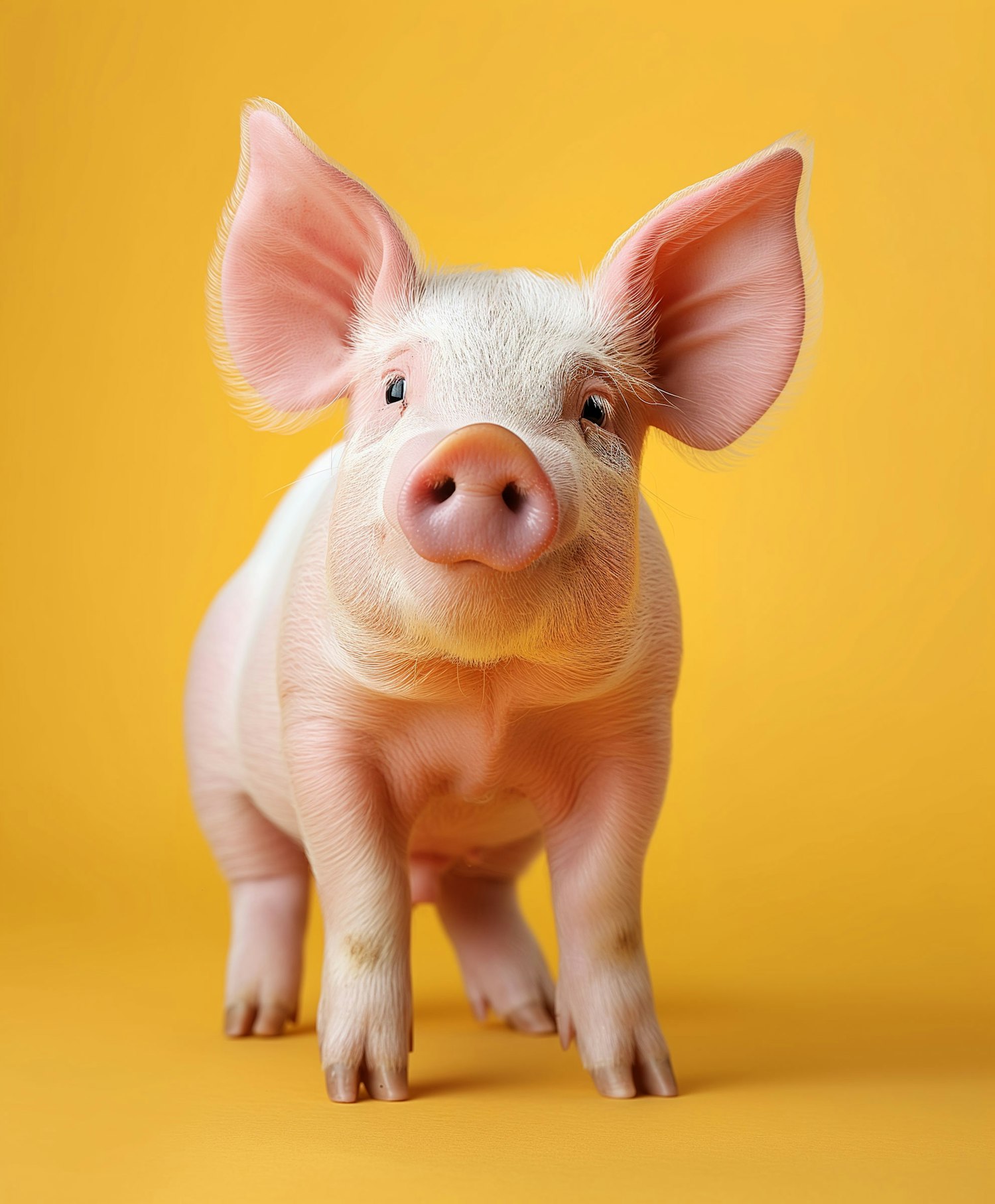 Adorable piglet with pink skin and floppy ears against a vibrant yellow background, creating a cheerful and lively scene.