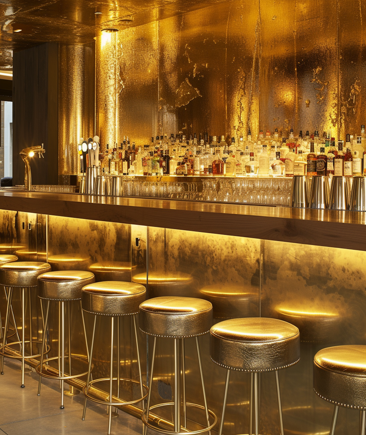 Luxurious bar with golden decor, featuring gold leather stools and a wide array of liquor bottles, creating an opulent atmosphere.