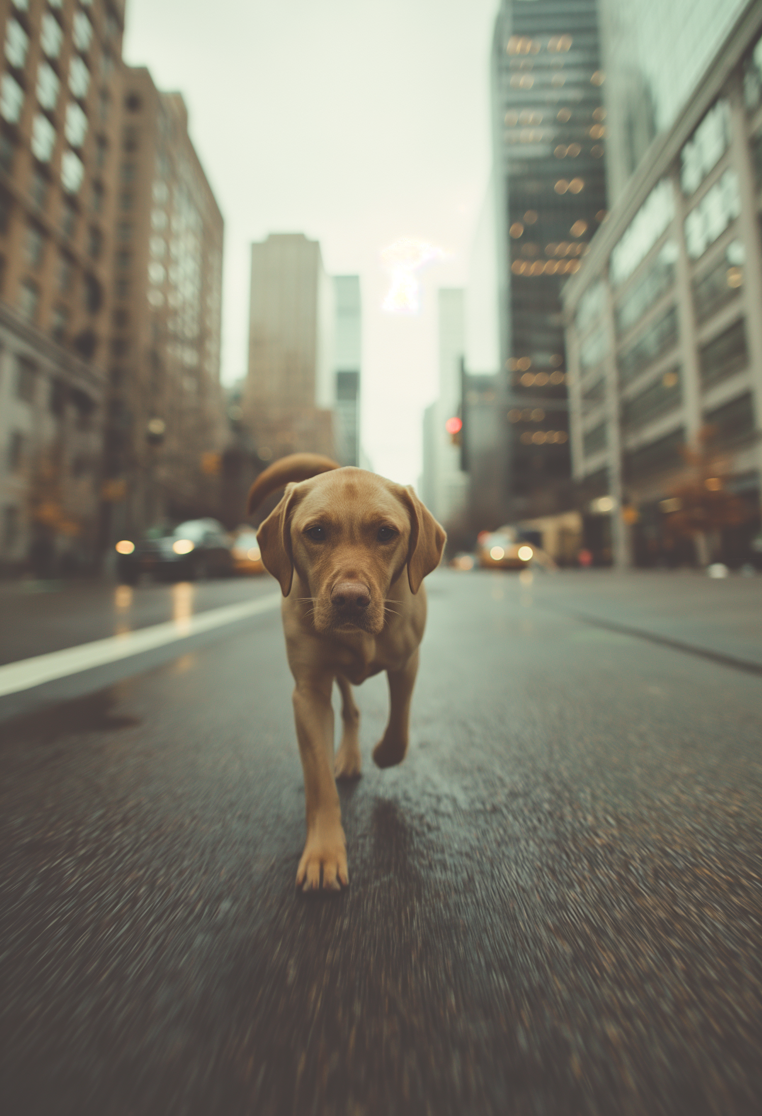 Golden Labrador retriever walking on a wet city street, surrounded by tall buildings and blurred urban traffic in the background.