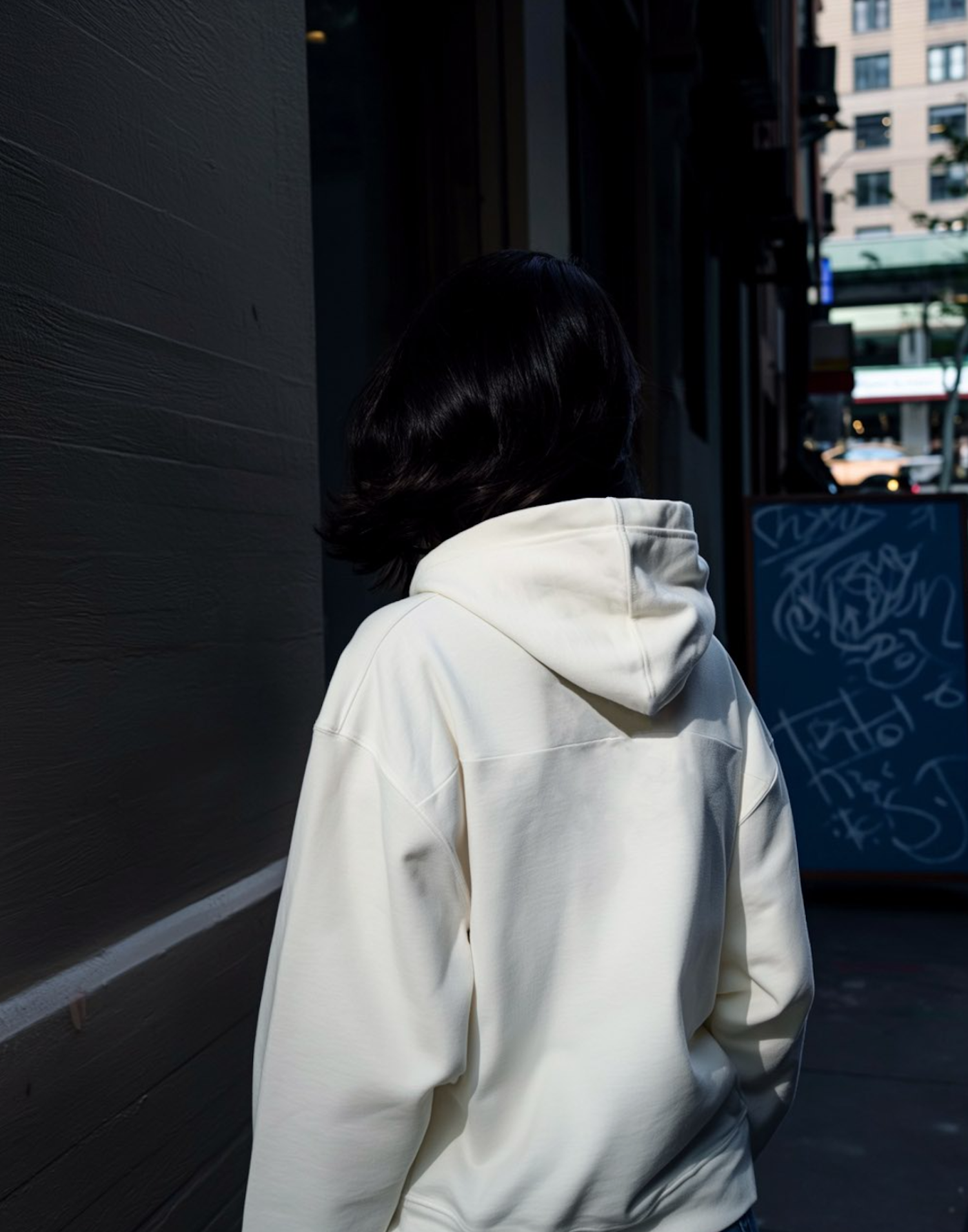 A person in a white hoodie walks through a shadowy urban alley with graffiti and city buildings in the background.