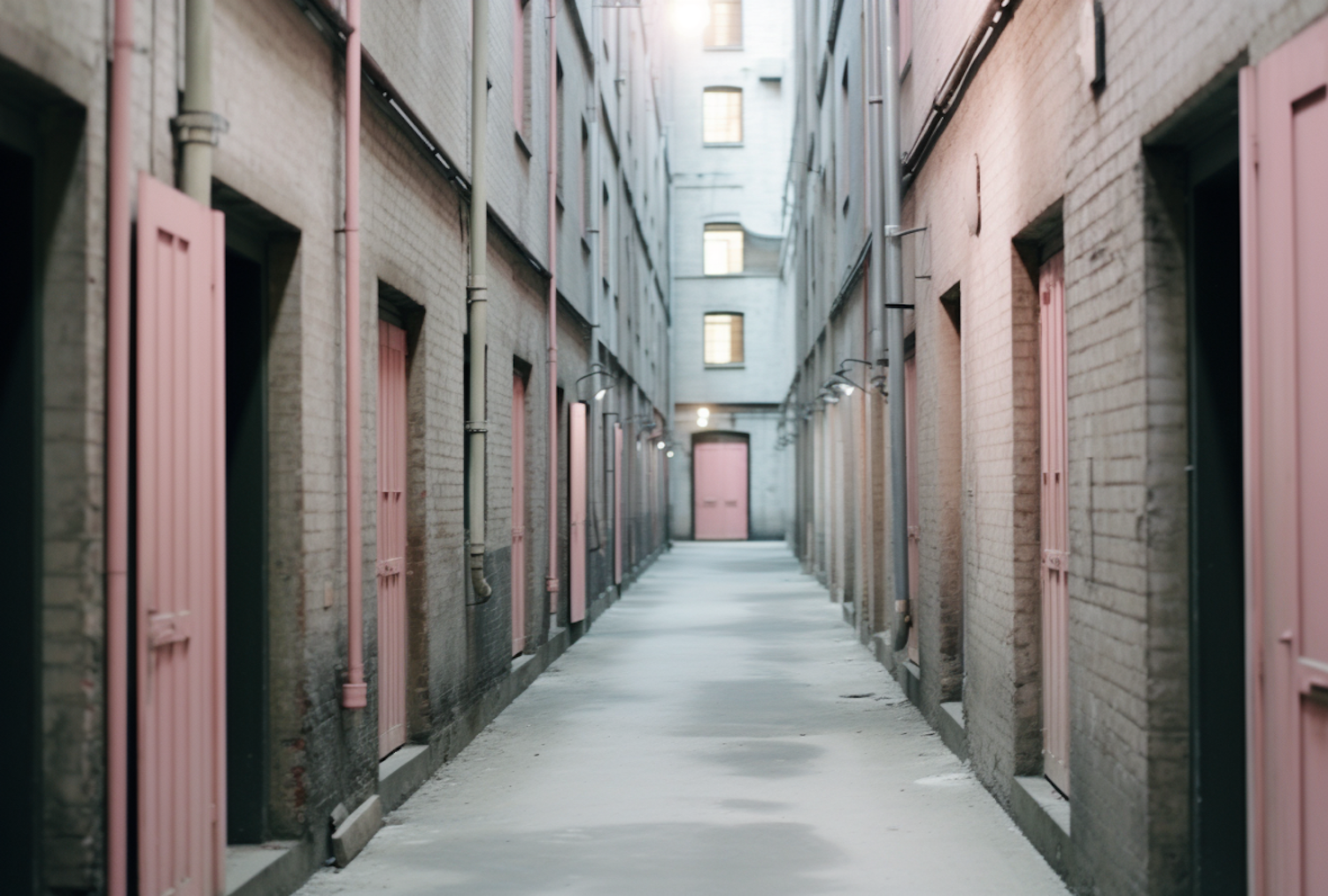 Symmetrical alleyway with pastel pink doors and beige brick walls, leading to a pink double door. Soft lighting creates a serene ambiance.