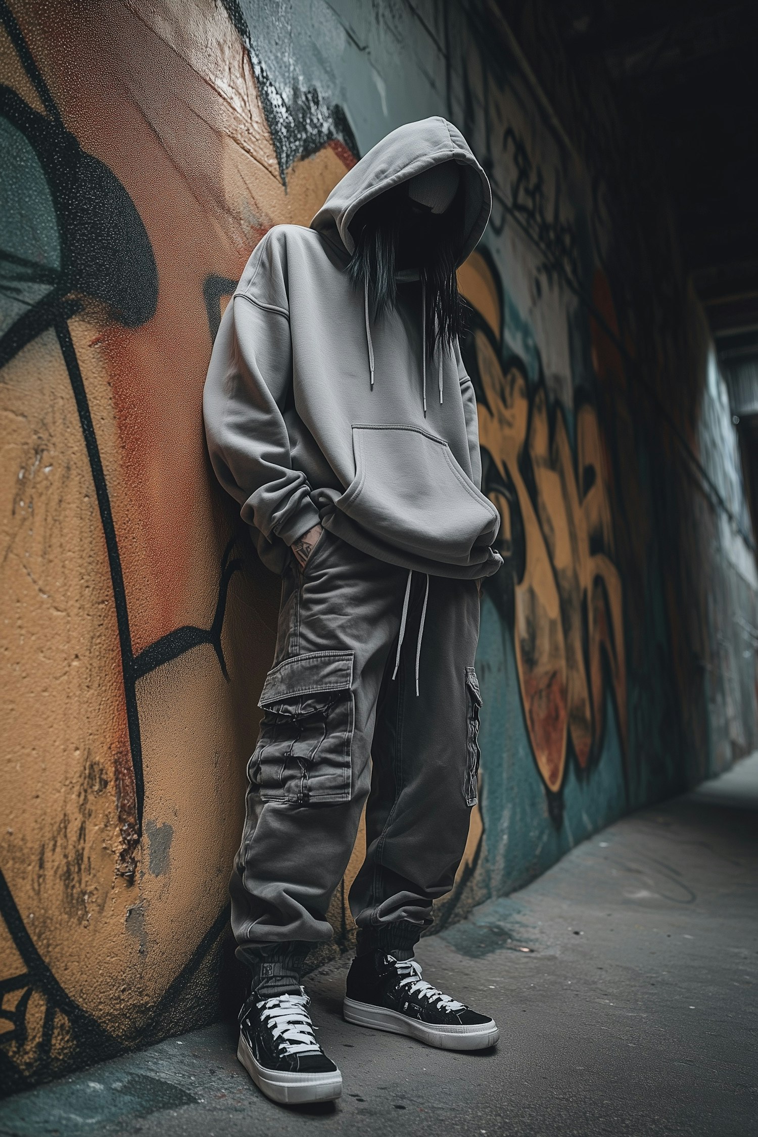 Mysterious figure in gray streetwear leans against a graffiti wall in a gritty urban alley. Bold graffiti contrasts with muted outfit tones.