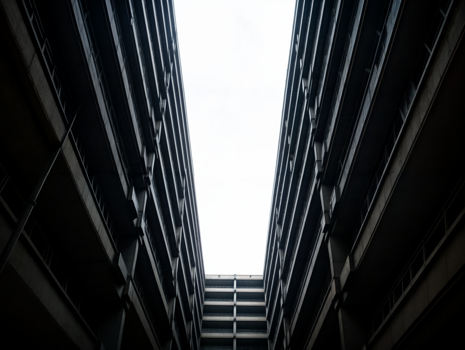 Dramatic view of tall, dark buildings forming a narrow alleyway against a bright sky, highlighting urban architecture and symmetry.