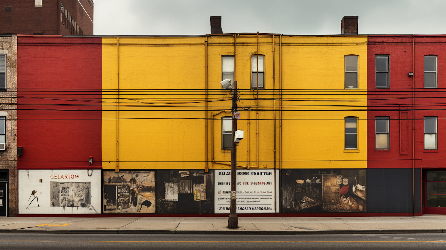 Colorful building facade with red and yellow stripes, power lines, and artistic posters. Urban street scene with overcast sky.