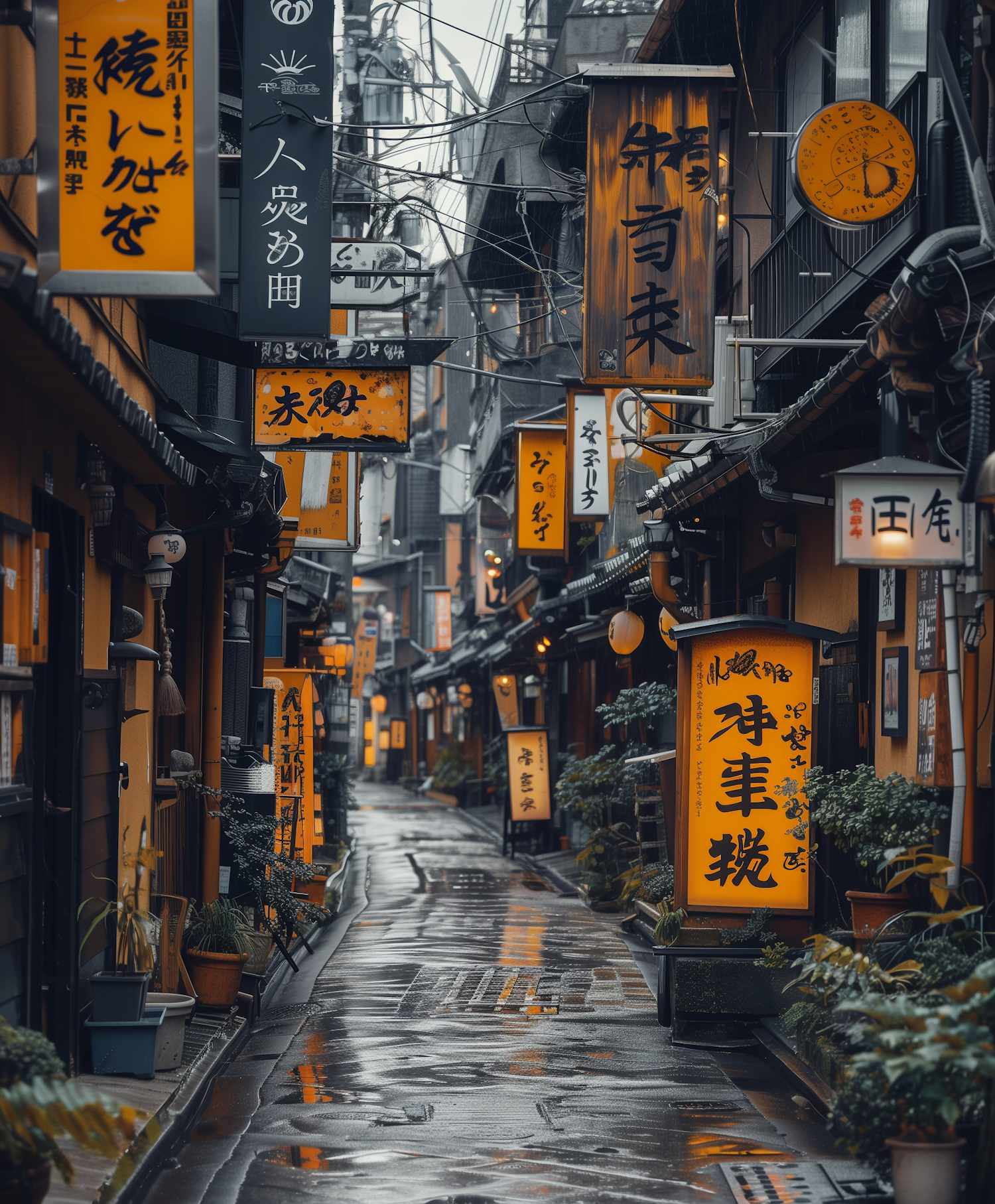 Rain-soaked Japanese alley with vibrant signage, wooden buildings, and potted plants, exuding a cozy and traditional charm.