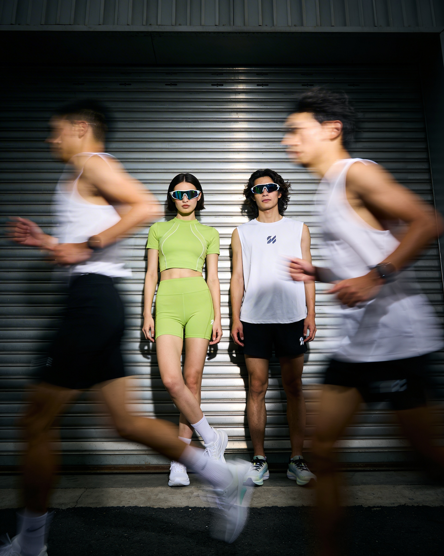 Dynamic urban scene with two stylish individuals in athletic wear, framed by blurred runners in motion against a metallic backdrop.