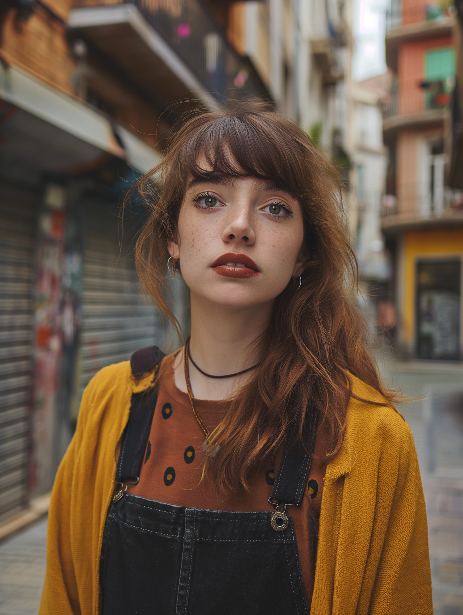 Young woman with brown hair and green eyes in urban street, wearing yellow cardigan and overalls. European city vibe.