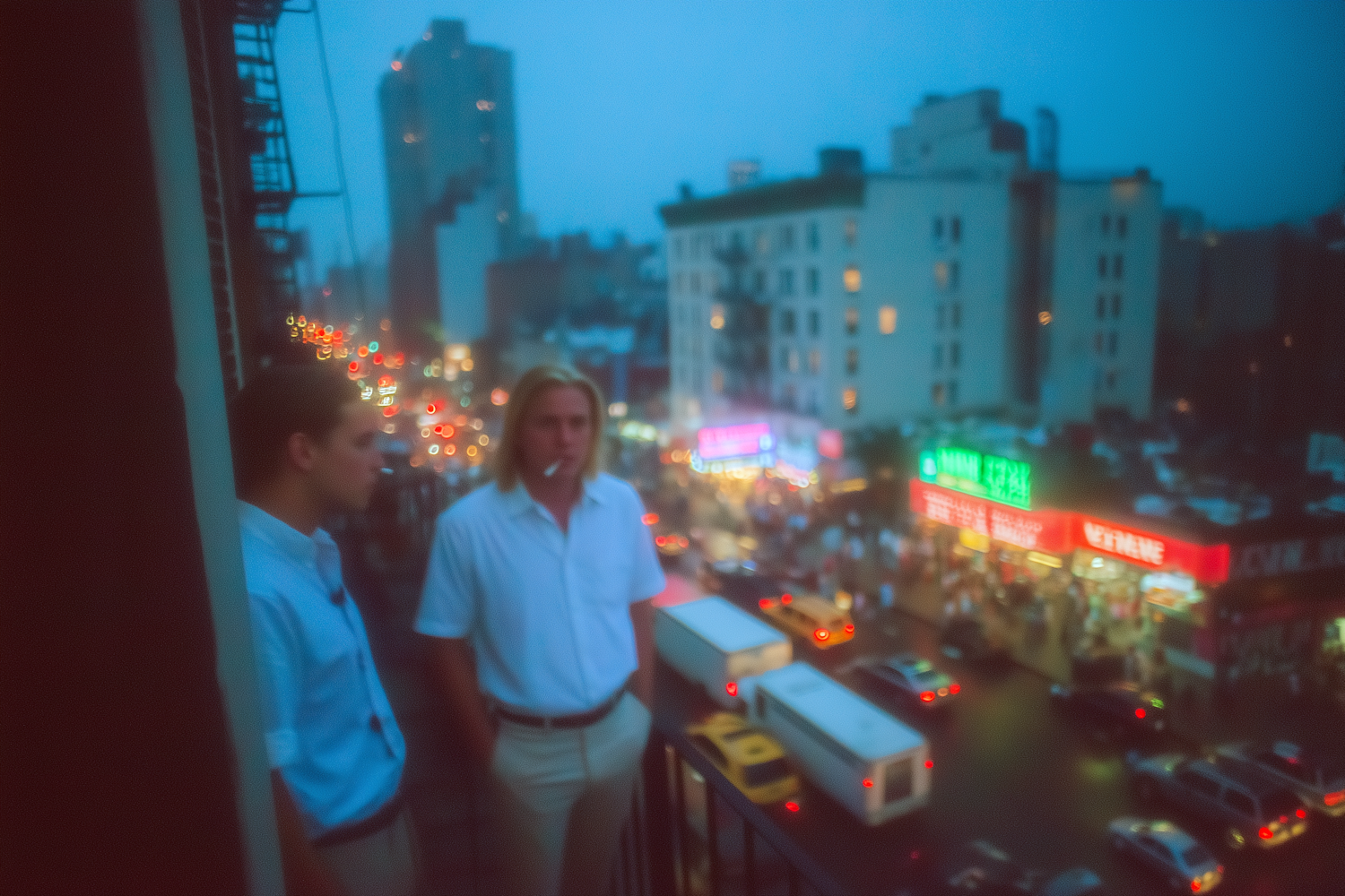 Two people on a balcony overlooking a vibrant city street at dusk, with neon lights and traffic creating a lively urban atmosphere.