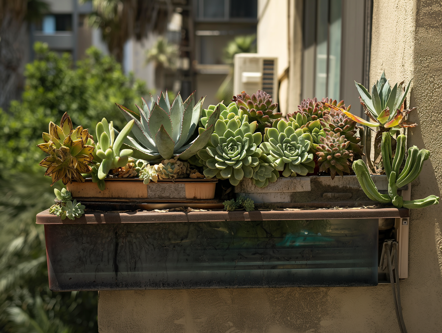 A diverse array of succulents in a rustic planter on a building wall, with urban greenery in the background.