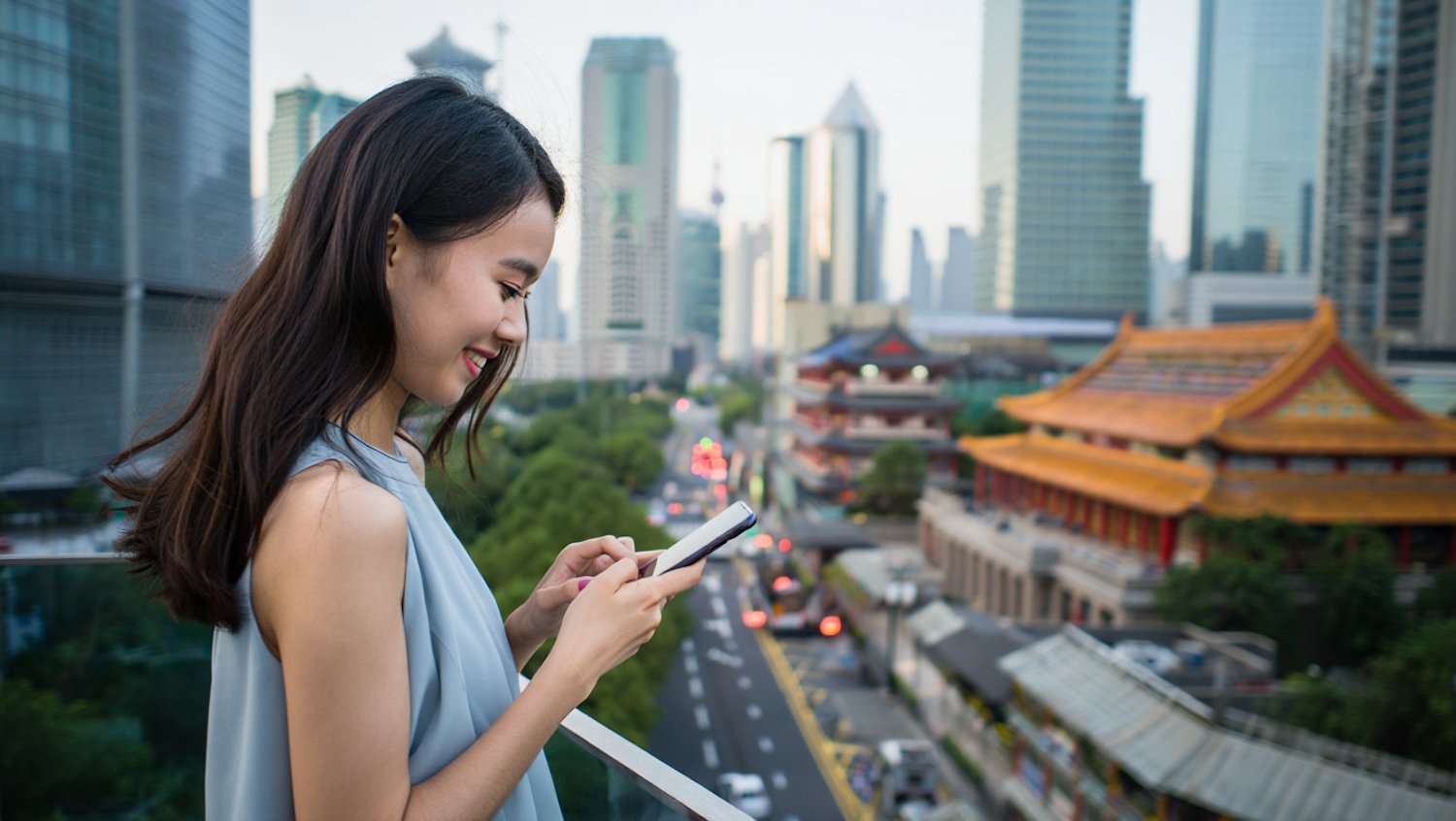 Smiling woman using her smartphone on a balcony with a cityscape of modern skyscrapers and a traditional Chinese building in the background.