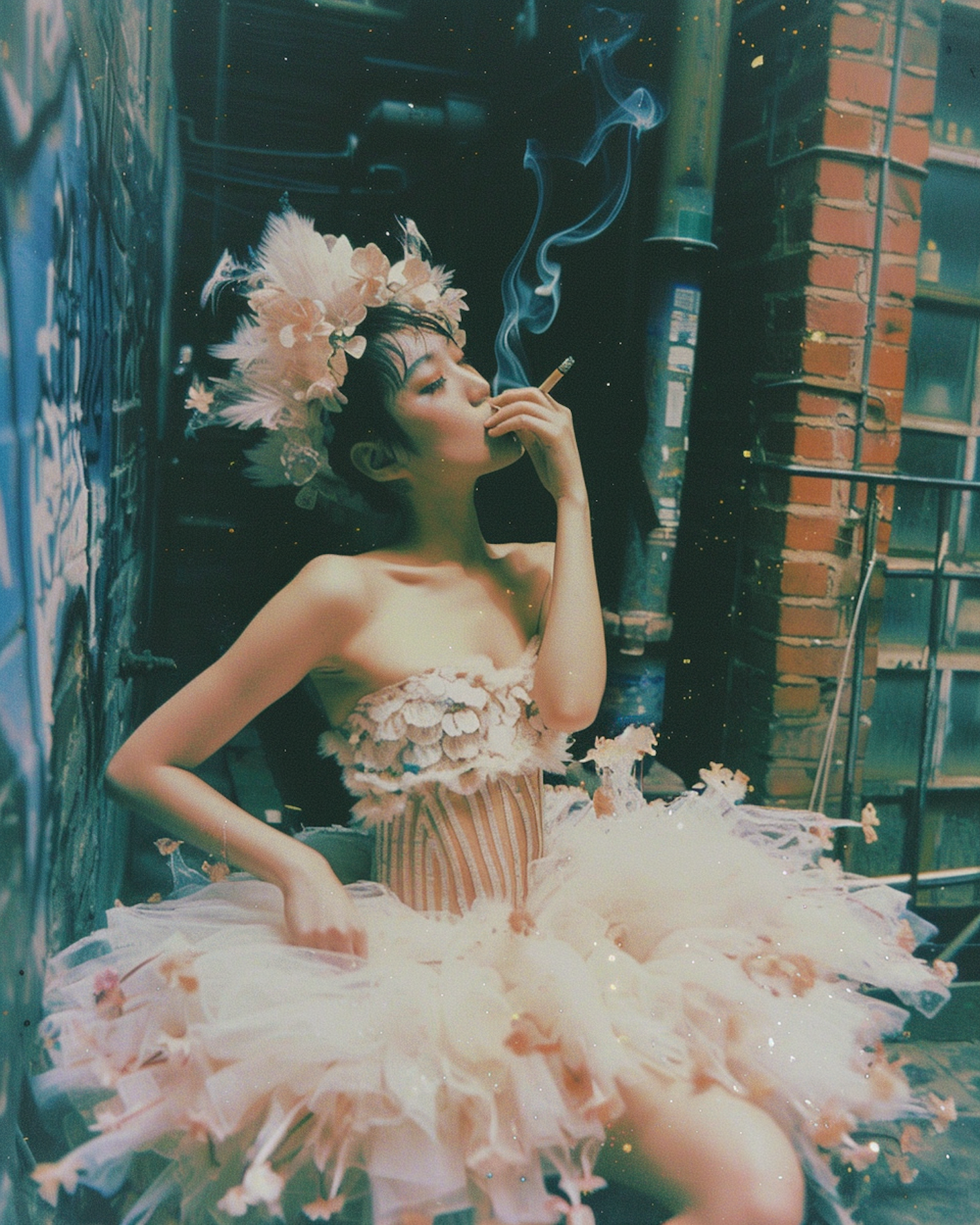 A woman in a floral dress and feathered headdress smokes in an urban alleyway, blending elegance with a gritty backdrop.