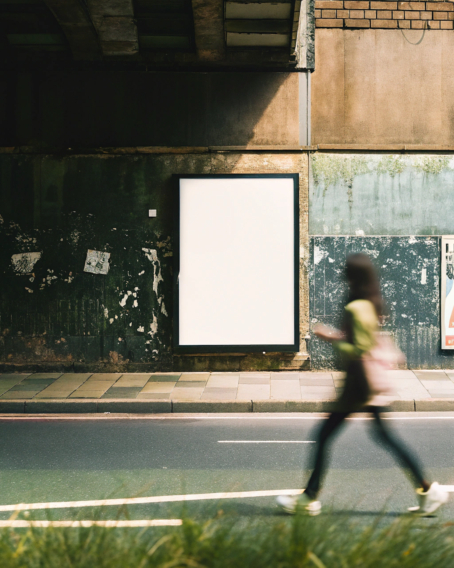 Urban scene with a blank billboard on a weathered wall, a blurred pedestrian walking by, and contrasting light and shadow under a bridge.