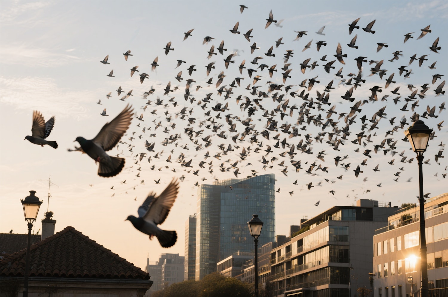 A flock of birds flying over a cityscape at sunset, with modern buildings and traditional rooftops in the background.