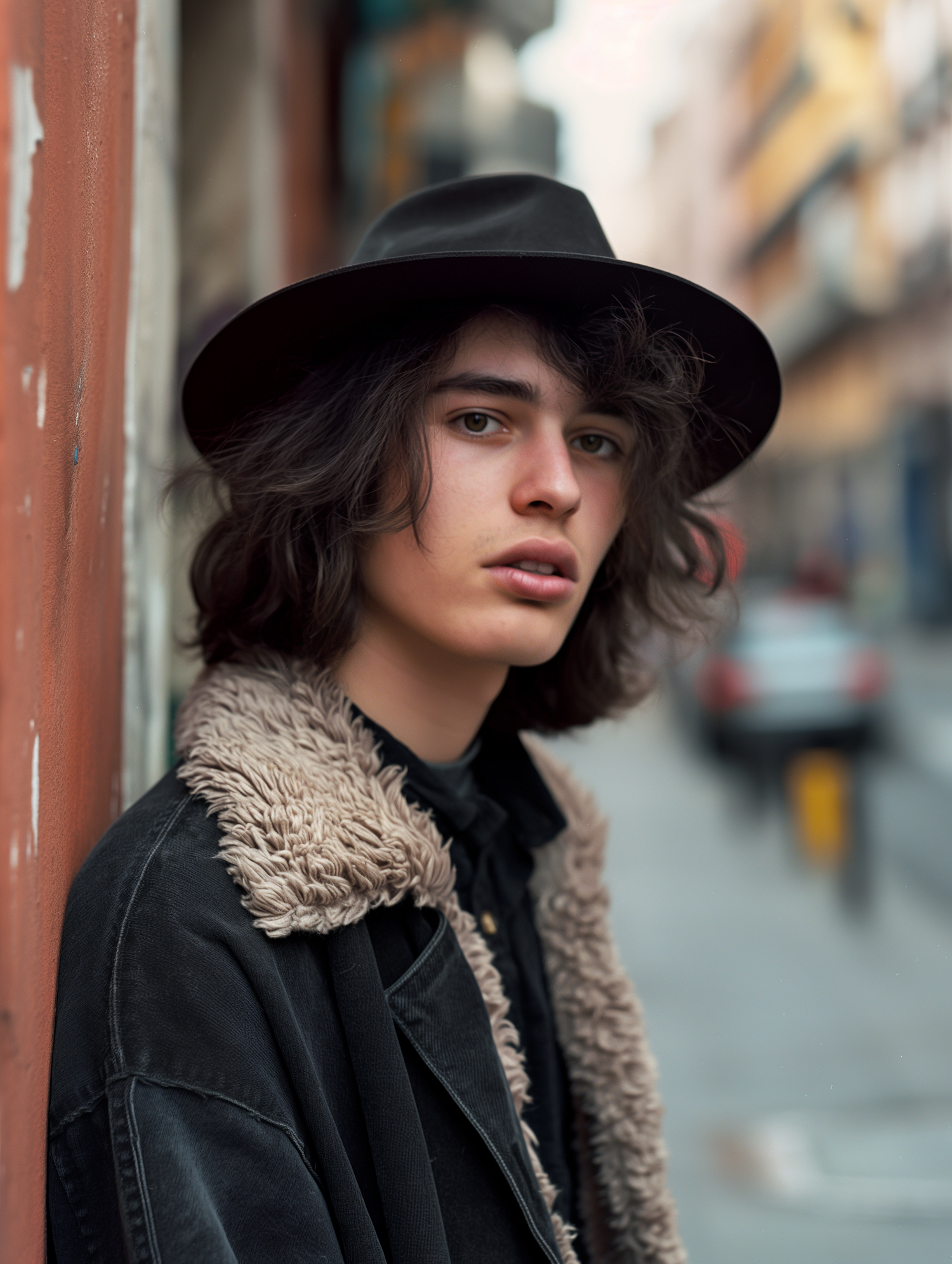 Young man with long hair and a hat in an urban setting, wearing a fur-collared coat. Moody and introspective vibe.