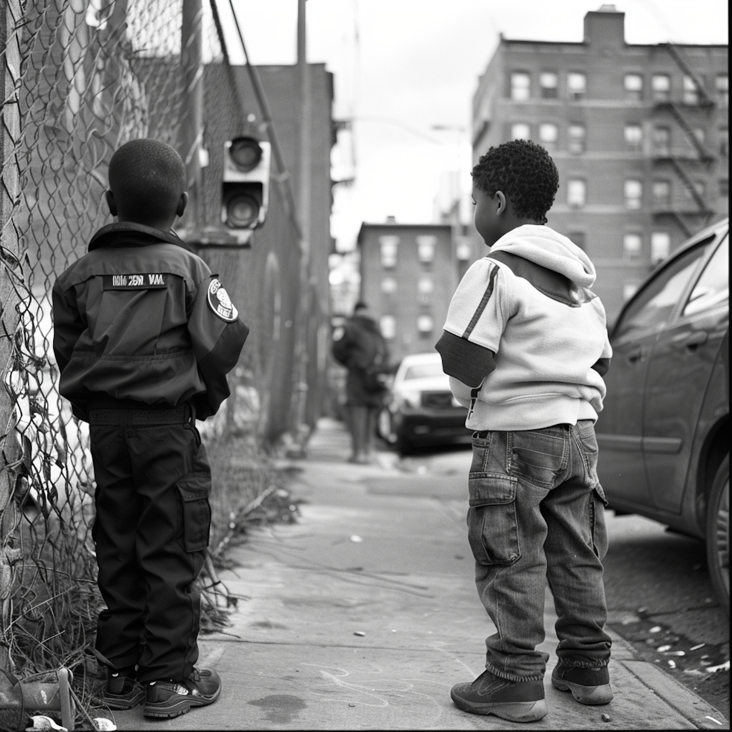 Two young boys stand on a city sidewalk, facing away, in a black and white urban scene with a chain-link fence and parked cars.