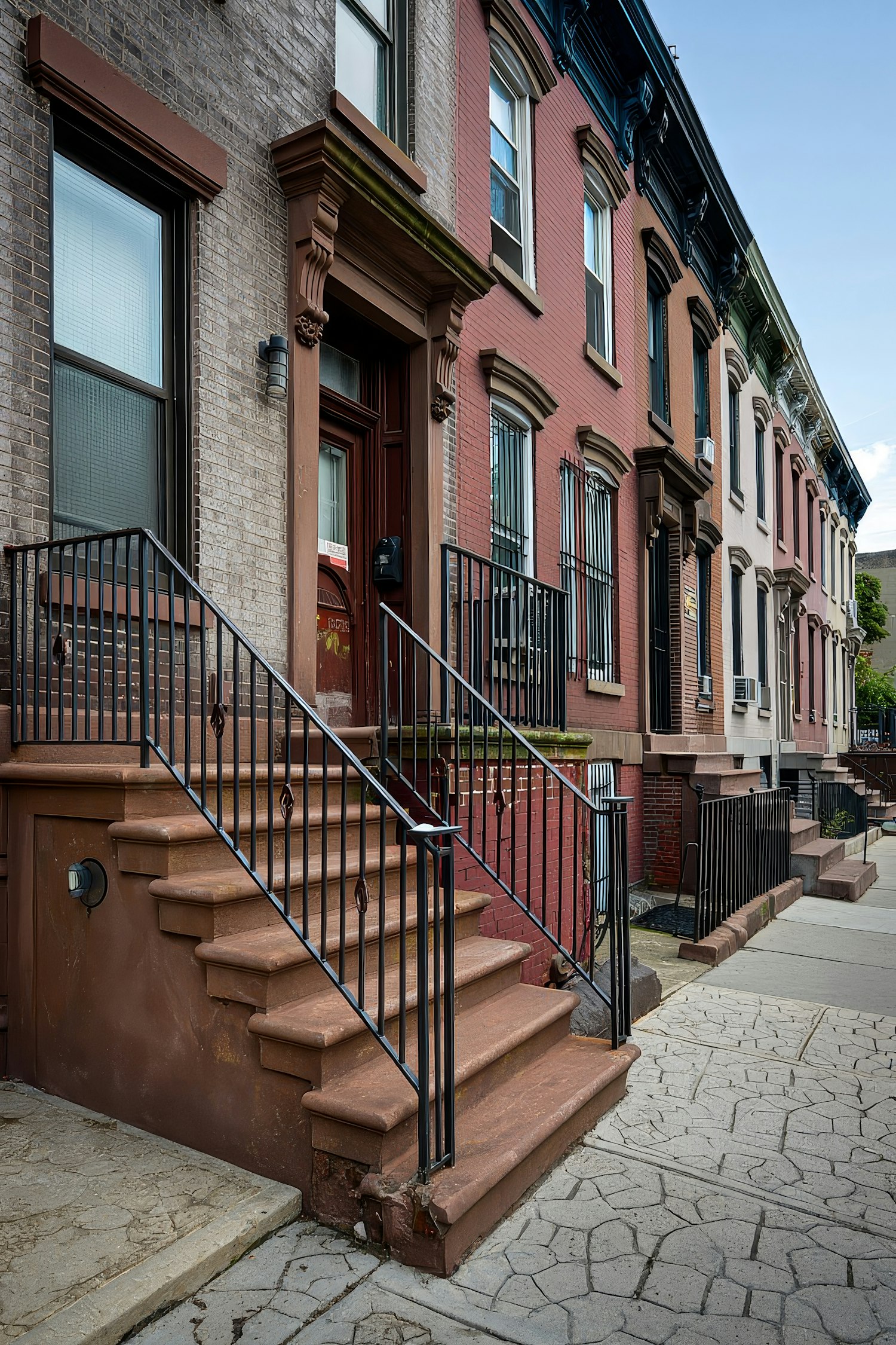 Charming row of urban brownstone buildings with ornate details, iron railings, and textured sidewalks on a sunny day.