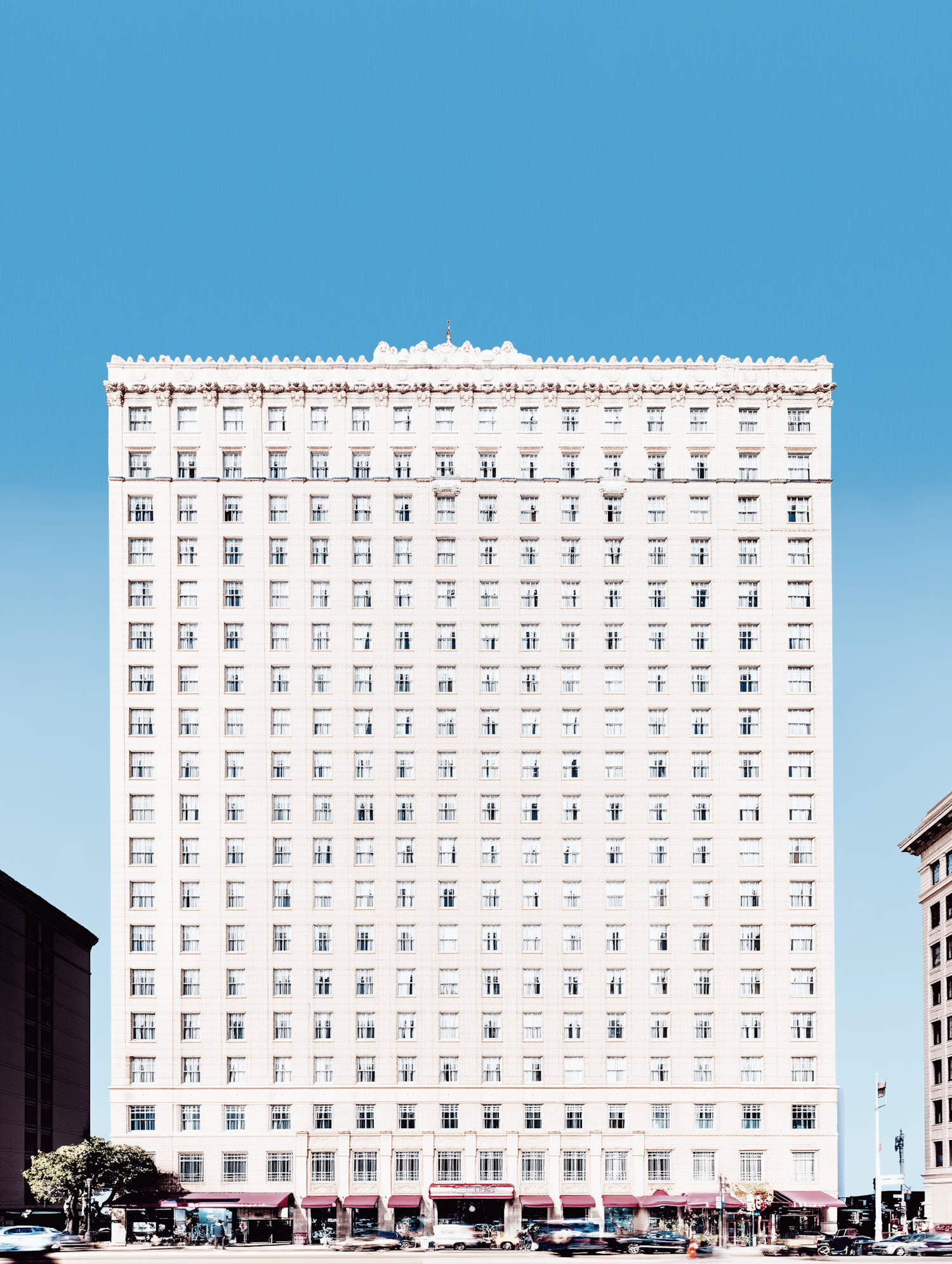 A tall, cream-colored, urban building with rows of windows, maroon canopies at street level, and a detailed cornice against a clear blue sky.