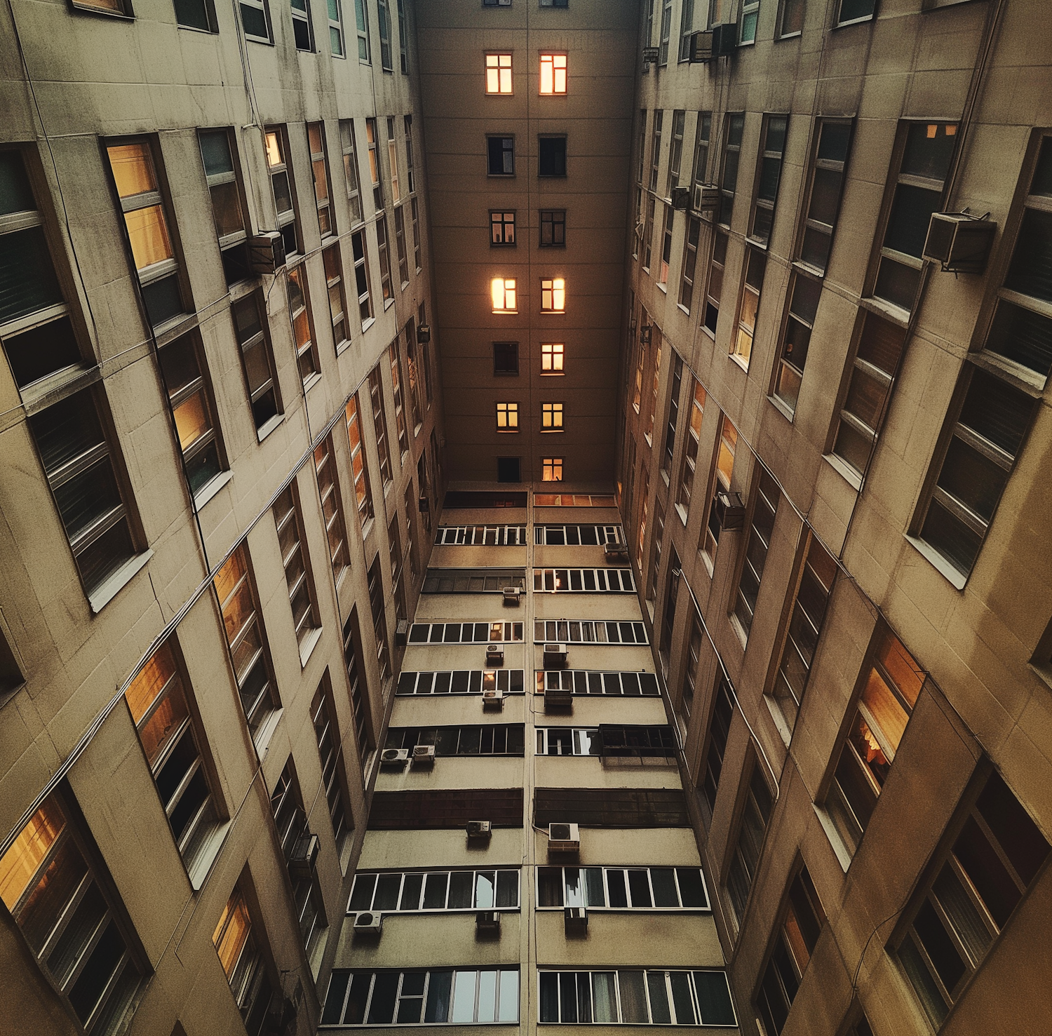 Upward view of a tall residential building with warm-lit windows, air conditioners, and a dramatic sense of depth and symmetry.