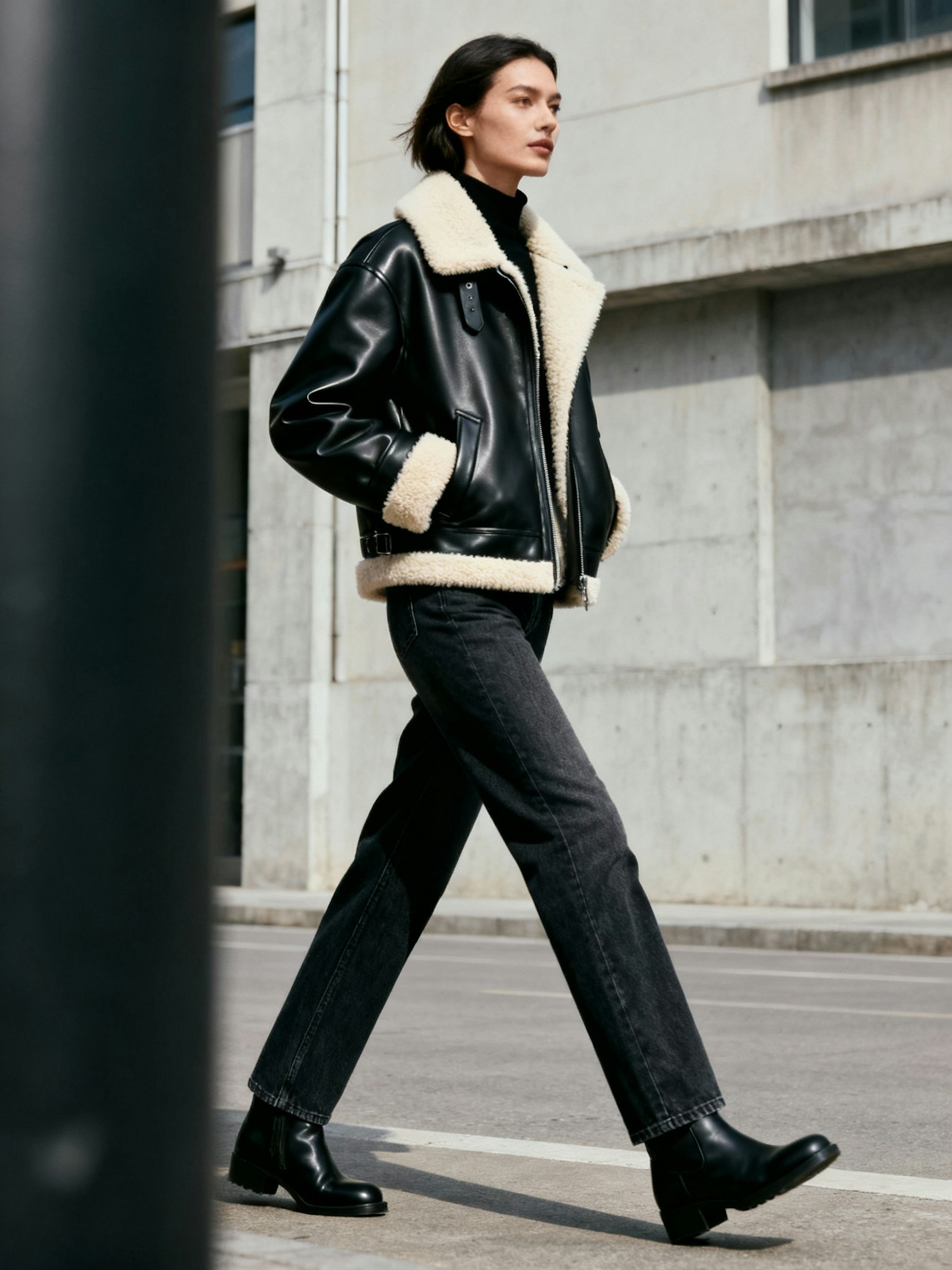 Editorial-style photo of a woman confidently walking down a clean urban street in daylight, wearing a black leather shearling jacket with cream fur details. Neutral-toned city buildings in the background, matte concrete textures, cool tone lighting, no golden hour glow, no graffiti, minimal shadows. She pairs the jacket with straight-leg jeans and black boots. Shot in 3/4 body angle, magazine-style street fashion aesthetic.
