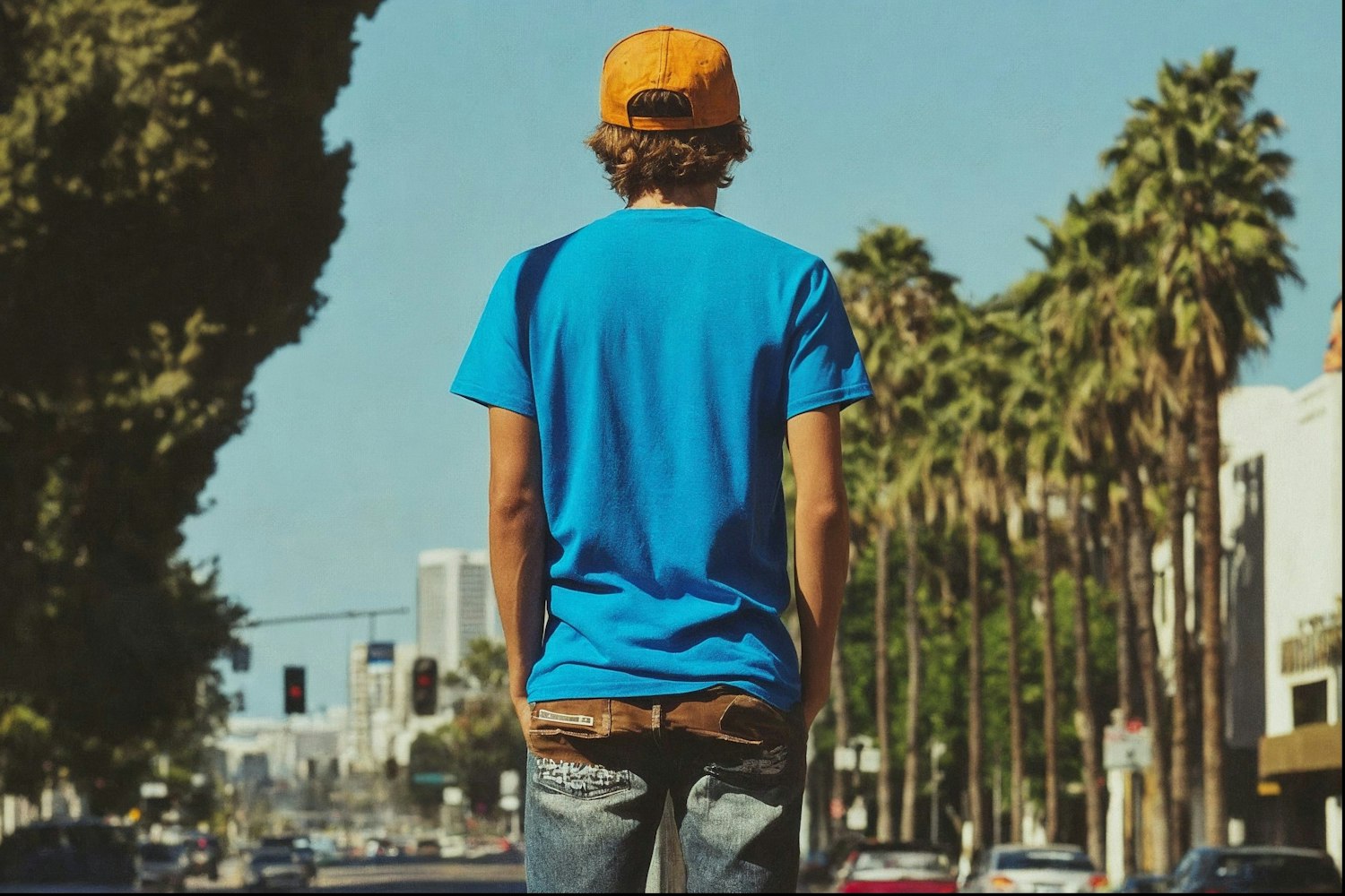 A young man in a blue T-shirt and orange cap stands on a sunny street lined with palm trees, creating a relaxed urban vibe.