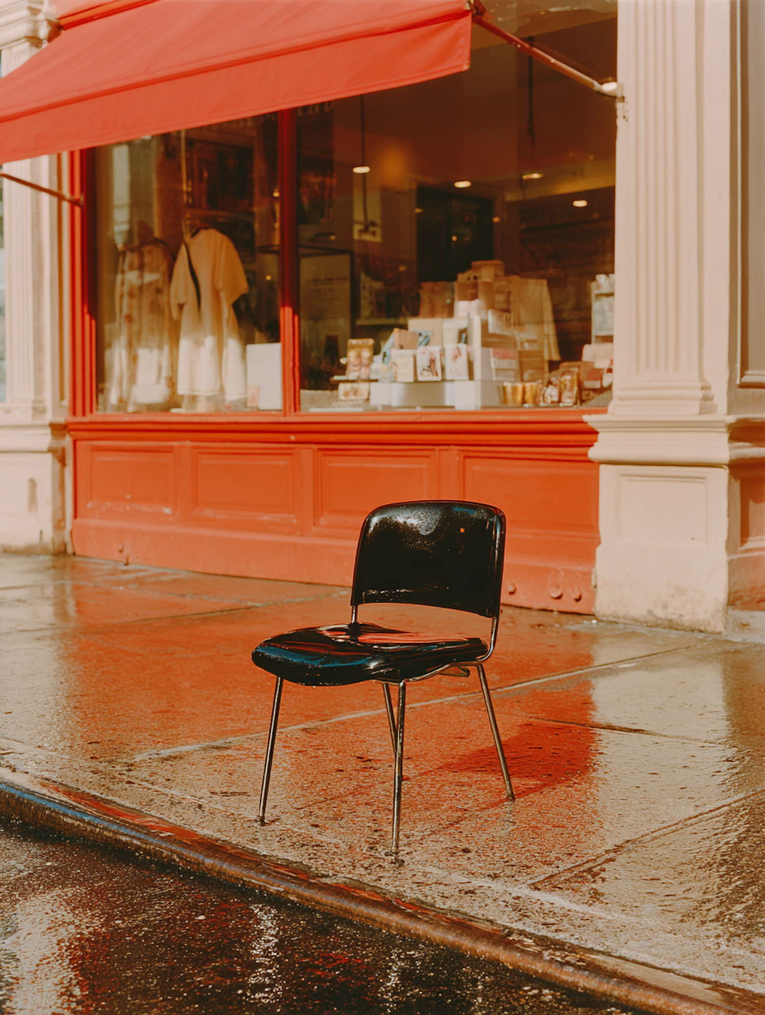 A black chair on a wet sidewalk in front of a red storefront with a vibrant awning, creating a striking urban scene.