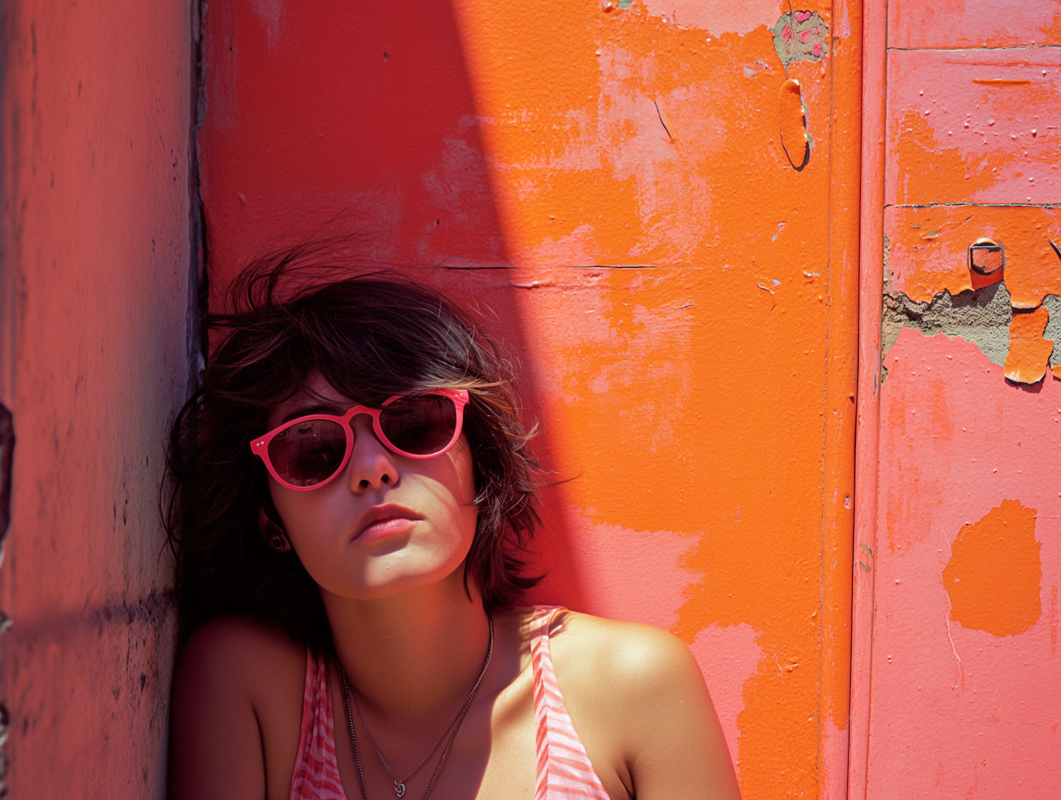 Young woman with pink sunglasses against a vibrant orange wall, exuding a relaxed urban vibe.