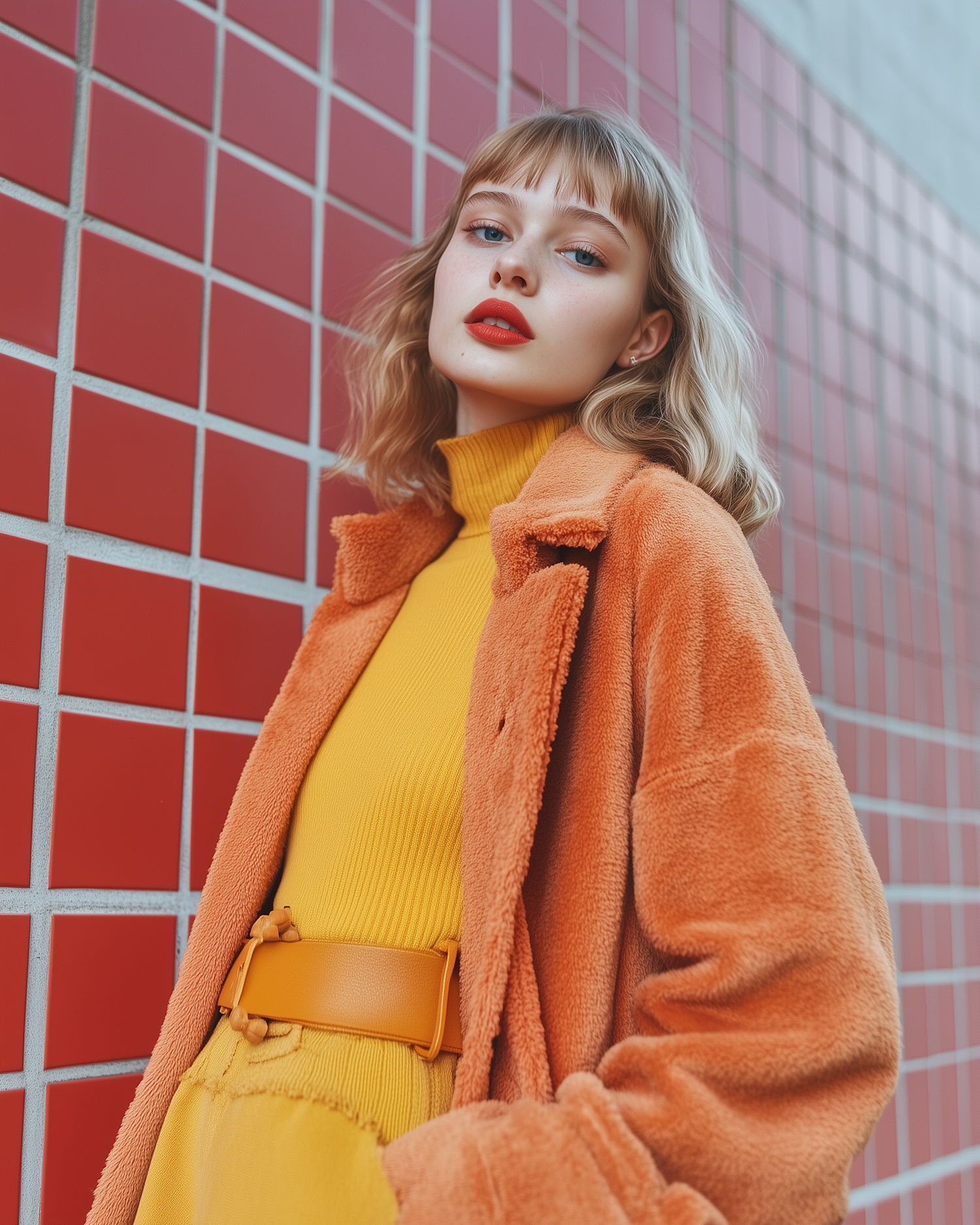 Stylish woman in orange coat and yellow dress poses against a red tiled wall, showcasing bold fashion and vibrant colors.