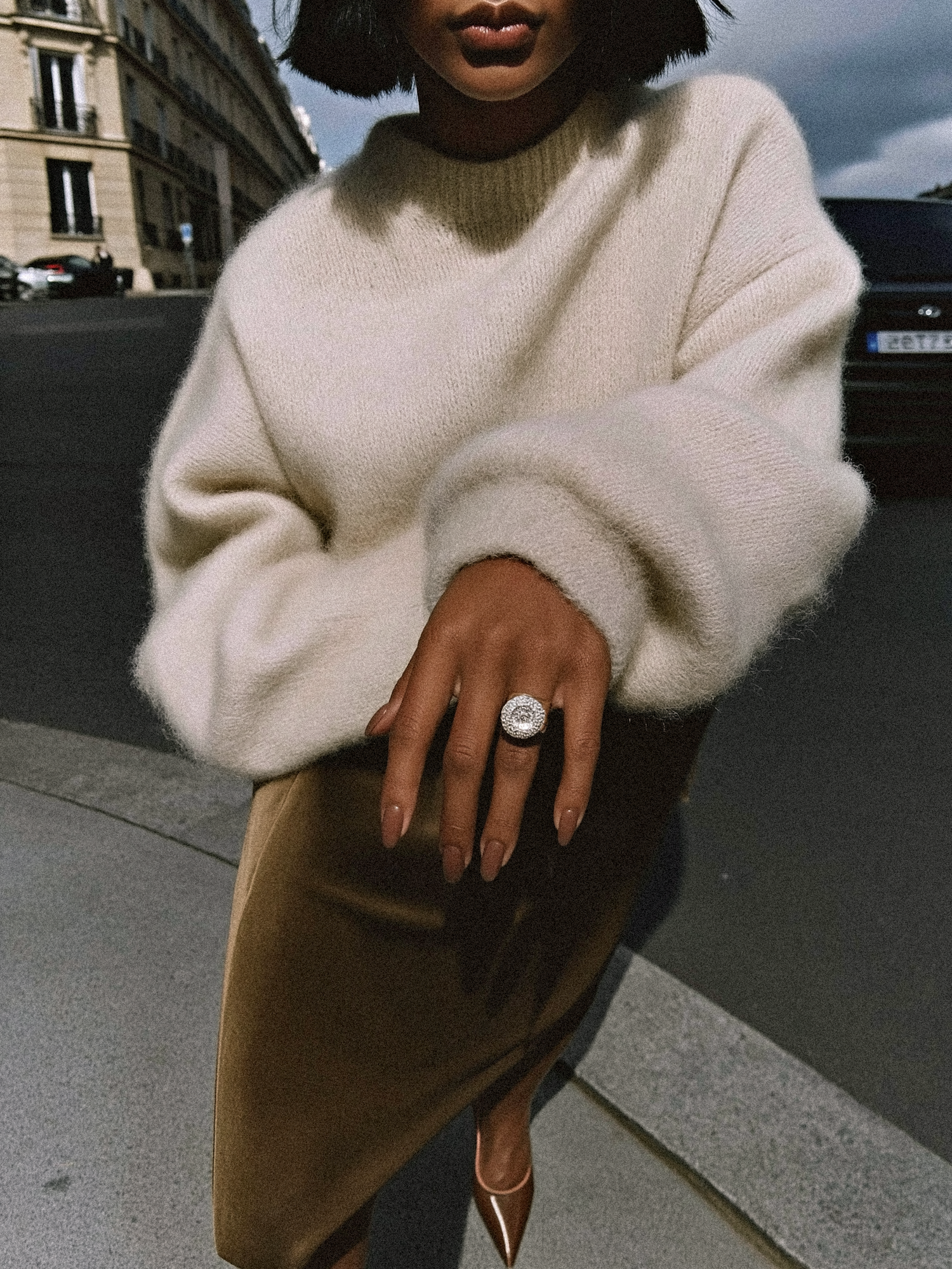 A fashionable person in a cream sweater and brown skirt showcases a statement ring in a chic urban setting with classic architecture.
