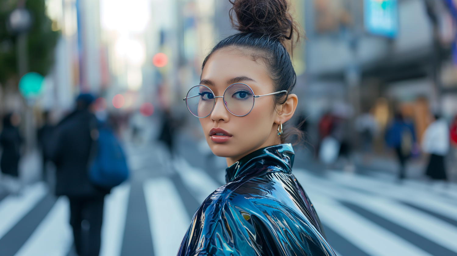 Stylish woman in metallic jacket and round glasses stands confidently on a busy city street, exuding modern urban vibes.