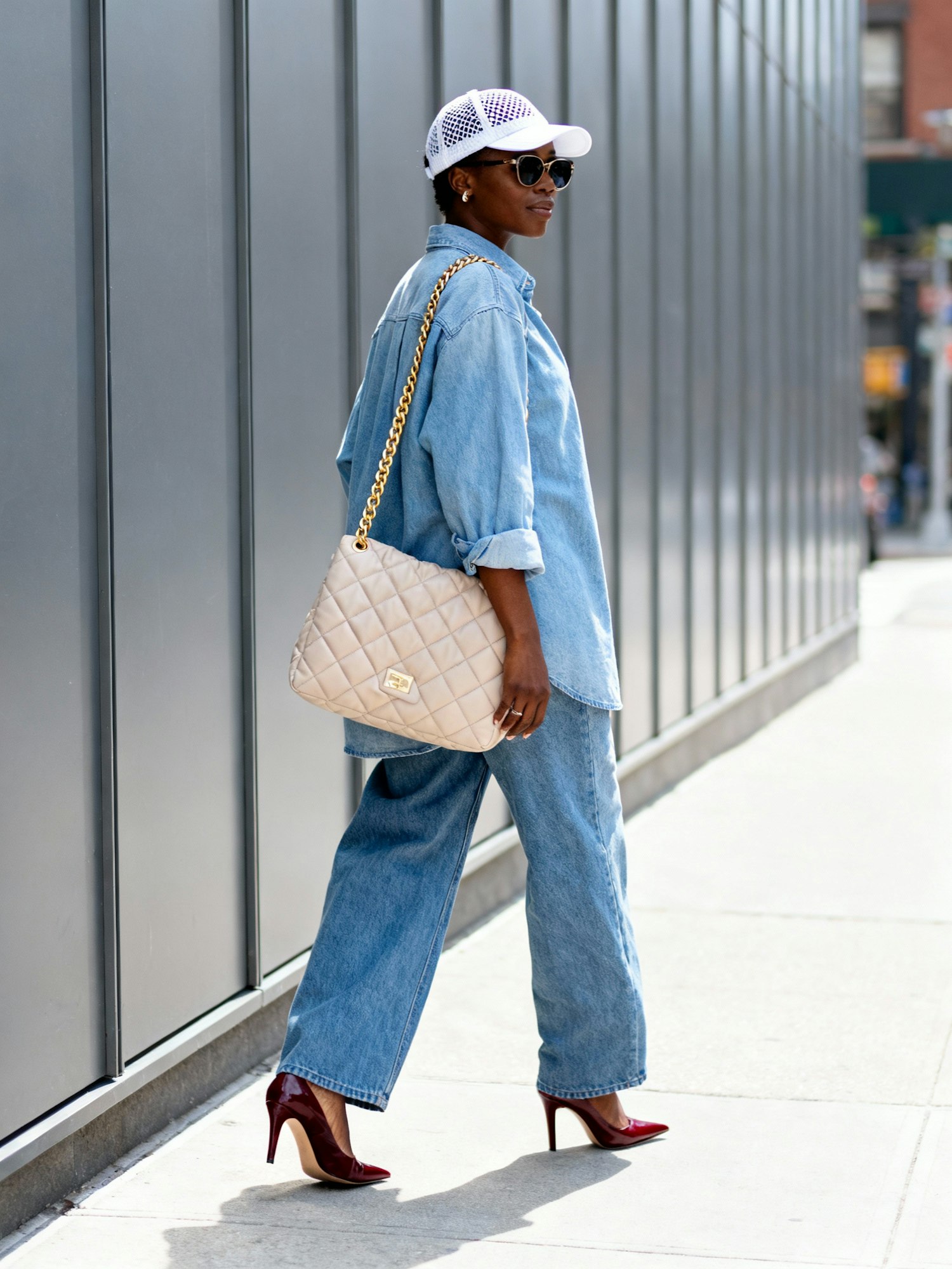 A fashionable person in denim and heels walks along a modern street, carrying a quilted handbag and wearing a white cap and sunglasses.
