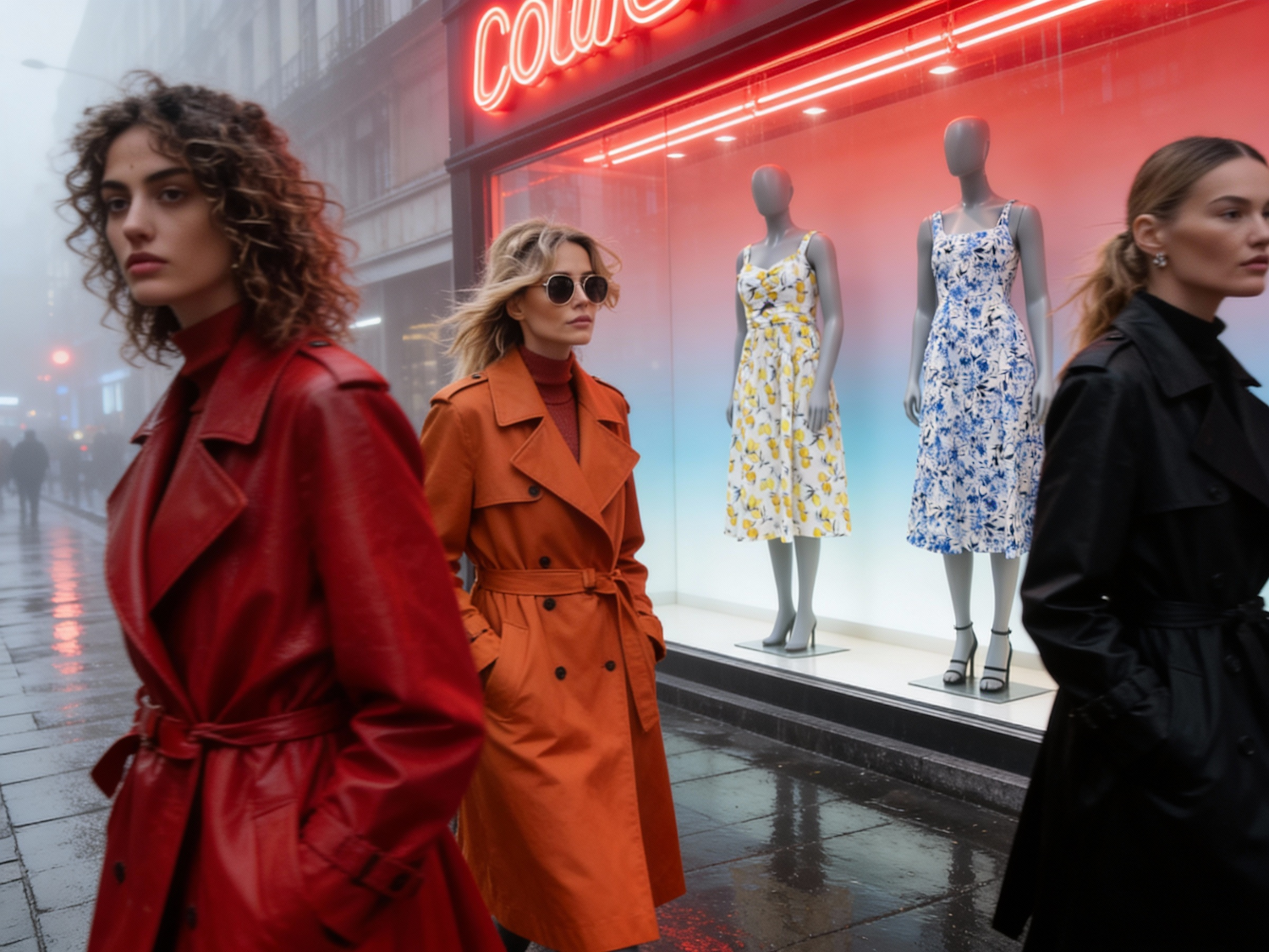 Stylish women in vibrant trench coats walk past a neon-lit store window displaying floral dresses on a foggy city street.