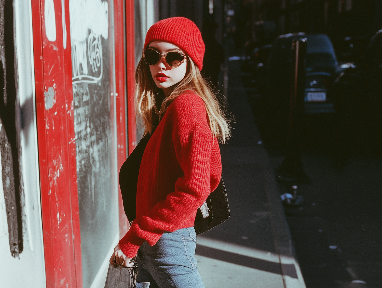 Stylish woman in red sweater and beanie, with sunglasses and bold lipstick, stands confidently on a city street.